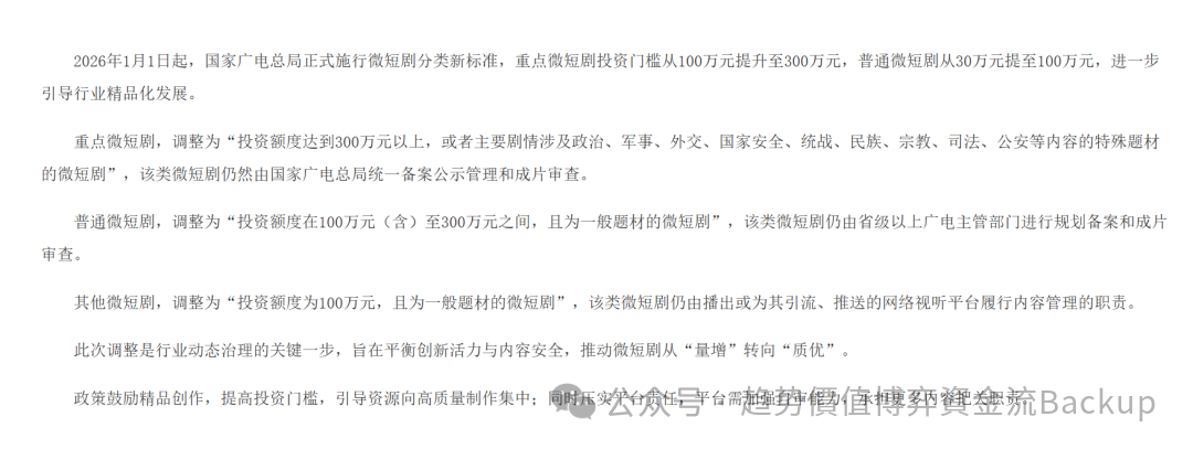 OCR:IMG:2026年1月1日起,国家广电总局正式施行微短剧分类新标准,重点微短剧投资门槛从100万元提升至300万元,普通微短剧从30万元提至100万元,进一步引导行业精品化发展。重点微短剧,调整为“投资额度达到300万元以上,或者主要剧情涉及政治、军事、外交、国家安全、统战、民族、宗教、司法、公安等内容的特殊题材的微短剧”,该类微短剧仍然由国家广电总局统一备案公示管理和成片审查。普通微短剧,调整为“投资额度在100万元(含)至300万元之间,且为一般题材的微短剧”,该类微短剧仍由省级以上广电主管部门进行规划备案和成片审查。其他微短剧,调整为“投资额度为100万元,且为一般题材的微短剧”,该类微短剧仍由播出或为其引流、推送的网络视听平台履行内容管理的职责。此次调整是行业动态治理的关键一步,旨在平衡创新活力与内容安全,推动微短剧从“量增”转向“质优”。政策鼓励精品创作,提高投资门槛,引导资源向高质量制作集中:同时乐实台任台需剪值博药流BaCkup