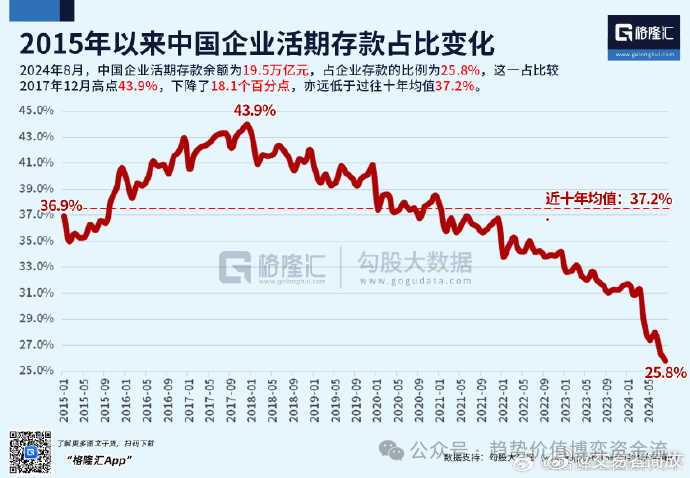 OCR:IMG:2015年以来中国企业活期存款占比变化G格隆汇2024年8月,中国企业活期存款余额为19.5万亿元,占企业存款的比例为25.8%,这一占比较2017年12月高点43.9%,下降了18.1个百分点,亦远低于过往十年均值37.2%。45.0%43.9%43.0%41.0%39.0%36.9%-近十年均值:37.2%37.0035.0%33.0%G隆C 勾股大数据31.0%www.gogudaia.com 29.0%27.0%25.0%25.8%20-50120150521-09216-012160052160921170121-05201-092010012018052018-09201-0520-9109号05202220202222222