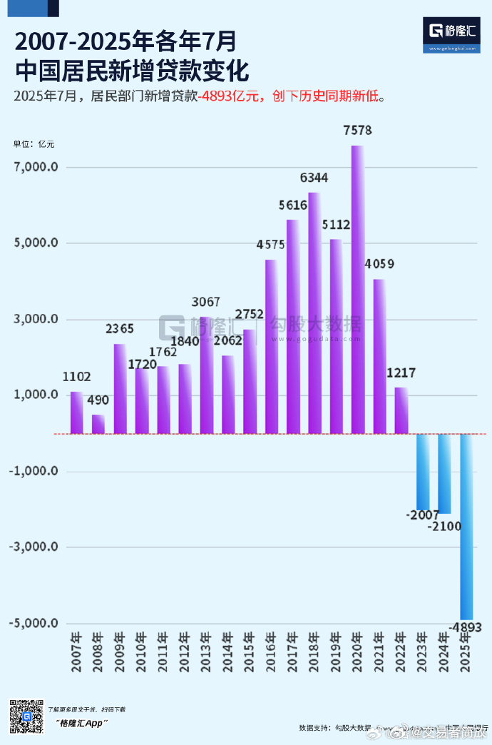 OCR:IMG:G格隆汇2007-2025年各年7月中国居民新增贷款变化2025年7月,居民部门新增贷款-4893亿元,创下历史同期新低。7578单位:亿元76344561651125,04575405930673,0275223651840206217621720110212171,000.0490-1,0.0-2007-2100-3,-5,000.0201020125-4893年年20135201452015520162017520185019202052021120252023320242025520005200520992001了解更多围文干背,扫码下载"格隆汇App"数据支持:勾股大数