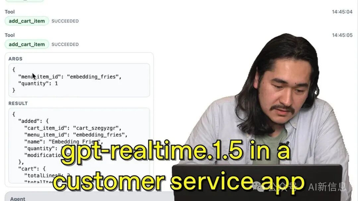 OCR:IMG:Tool 14:45:04 add_cart_item SUCCEEDED Tool 14:45:05 add_cart_item SUCCEEDED ARGS f "menkitem_id":"embedding_fries", "quantity":1 P RESULT { "added":{ "cart_item_id":"cart_szegyzgr" "menu_item_id":"embedding_fries" "name":"Embedding "quantity": gpt-realtime.1.5 in a "modificati ), "cart":{ "totalLin customerservice app "totalTt AI新信息