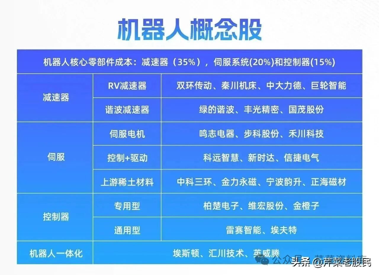 OCR:IMG:机器人概念股 机器人核心零部件成本:减速器(35%),同服系统(20%)和控制器(15%) RV减速器 双环传动、秦川机床、中大力德、巨轮智能 减速器 谐波减速器 绿的谐波、丰光精密、国茂股份 伺服电机 鸣志电器、步科股份、禾川科技 伺服 控制+驱动 科远智慧、新时达、信捷电气 上游稀土材料 中科三环、金力永磁、宁波韵升、正海磁材 专用型 柏楚电子、维宏股份、金橙子 控制器 通用型 雷赛智能、埃夫特 机器人一体化 埃斯顿、汇川技术、英威腾 众 条@芹菜老股民