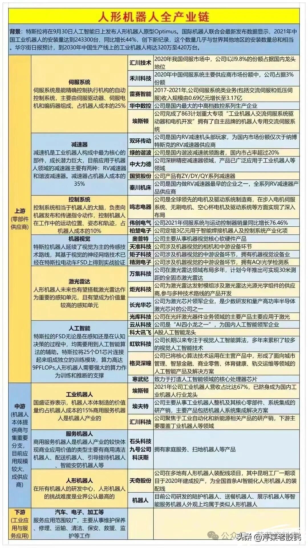 OCR:IMG:人形机器人全产业链 背景:特斯拉将在9月30日人工智能日上发布人形机器人原型Optimus。国际机器人联合会最新发布数据显示,2021年中 国工业机器人的安装量达到243300台,同比增长44%,创下新纪录,这个数量几乎与世界其他地区的安装数量总和相当 华尔街日报预计,到2030年中国生产线上的工业机器人将达320万至420万台。 汇川技术 2020年我国伺服市场中,公司以19.8%的份额占据国内龙头 地位 禾川科技 2020年中国伺服系统主要供应商市场份额中,公司占据3% 伺服系统 份额 伺服系统是能精确控制执行机构的自动 雷赛智能 2017-2021年,公司伺服系统类业务(包括交流伺服和低压伺 控制系统,主要由伺服驱动器、伺服电 服)收入规模由0.69亿元增长至3.17亿 机和编码器组成,占机器人成本的25%华中数控公司是国内最大的中高档数控系列生产企业 公司完成了863计划重大专项“工业机器人交流伺服系统驱 埃斯顿 动器和电机开发拥有了自主品牌的机器人专用交流伺服系 统 双环传动 公司是国内RV减速机头部玩家,为国内市场份额仅次于纳博 减速器 特斯克的RV减速器供应商 减速机是工业机器人构成中最为核心的 绿的谐波公司是国内谐波减速就领跑者,国内市占率超过20% 部件,成长潜力巨大,自前应用于机器 中大力德 公司深耕精密减速器领域,产品已广泛应用于工业机器人等 人领域的减速器主要有两种:RV减速器 领域 和谐波减速器。减速器占机器人成本的国贸股份公司产品有ZY/DY/QY系列减速器 35% 公司是国内做RV减速器最早的企业之一,全系列RV减速器产 秦川机床 品供应商 控制系统 公司是全球领先的电机及驱动系统制造商,在步入电机伺服 上游 控制系统相当于机器人的大脑,负责向 鸣志电器系统、无刷电机、空心杯电机及驱动系统等方面实现了深入 (零部件 机器发布和传递指令动作,控制机器人 布局 在工作中的运动位置、姿态和轨迹,占伟创电气公司2021年伺服系统与运动控制器销量同比增长76.46% 供应商) 机器人成本的10% 柏楚电子公司定增3亿元用于智能焊接机器人及控制系统产业化项 机器视觉 奥普特 公司主要从事机器视觉核心软硬件产品 特斯拉机器人延续了视觉为主的传感技 天准科技公司涉及机器视觉的相机和中游设备环节 术路线,其基于视觉的神经网络技术已矩子科技公司涉及机器视觉的中游设备环节,拥有机器视觉设备业 经在特斯拉电动车FSD上得到实战验证精测电子公司涉及机器视觉的中游设备环节,拥有AQI光学检测系 万集科技 公司在激光雷达领域布局多年,计划今年推出可实现30米测 激光雷达 距的全固态激光雷达 人形机器人未来也有望搭载激光雷达作炬光科技 公司为激光雷达发射模组涉及激光雷达光源光学组件的供应 商,参与多种技术路线的产品开发 为重要的感知单元,且有望成为价值量 较高的感知单元 长光华芯 公司为激光芯片领军企业,是少数研发和量产高功率半导体 激光芯片的公司之一 光库科技 公司在光纤激光器件业务领域的主要产品主要应用于激光 云从科技公司是“AI四小龙之 为国内人工智能领军企业 人工智能 特斯拉的FSD无论是在感知还是在认知 科大讯飞A股人工智能龙头 虹软科技 公司长期以来专注于视觉人工智能算法,多年来累积了较多 决策的过程中,均需要用到人工智能算 法的辅助。特斯拉将25个D1芯片连接 的视觉人工智能技术 起来组成独立的训练模块,算力高达 公司已将核心算法技术运用在主营产品中,形成了面向城市 格灵深瞳 管理、智慧金融、商业零售、体育健康、轨交运维等领域的 9PFLOPs.人形机器人需要强大的算力作 为训练和推断的支撑 人工智能产品及解决方案 寒武纪 致力于打造人工智能领域的核心处理器芯片 埃斯顿 2021年公司工业机器人营收占比达67%,已路身成为国内工 工业机器人 业机器人行业龙头 中游 国盛证券表示,机器人本体制造的价值 公司主要从事工业机器人整机及其核心零部件、系统集成的 量约占机器人成本的15%商用服务机器 埃夫特 (机器人 研产销,主要产品包括机器人系统集成解决方案 本体提 人是机器人产业的 汇川科技 公司聚焦于工业自动化和新能源相关产品的研产销,下游主 供商与 要覆盖丁业机器人等领域 服务机器人 集重要 分支, 商用服务机器人是机器人产业的较快体 石头科技 目前应 现商业应用价值的类型主要有商用清洁 九号公司 拥有家庭服务、扫地机器人等产品 用规模 机器人、配送机器人、引导接待机器人 科沃斯 较大、 智能安防机器人等 成供应 公司在多地有人形机器人装配线项目,其中昆明工厂一期项 人形机器人 天奇股份 商 目于2020年建成投产,为全国首条AI智能化人形机器人的装 在所有机器人的研发中心,人形机器人 配线 的挑战难度是业界公认最高的 机器人 目前公司研发的陪护机器人、送餐机器人、展示机器人等智 能服务机器人外观上均属于类似人形机器人 下游 汽车、电子、加工等 (工业应 服务应用范围较广,主要从事维护保养 用与服 修理、运输、清洁、保安、救援、监 务应用) 护等工作 头条@芹菜老股民