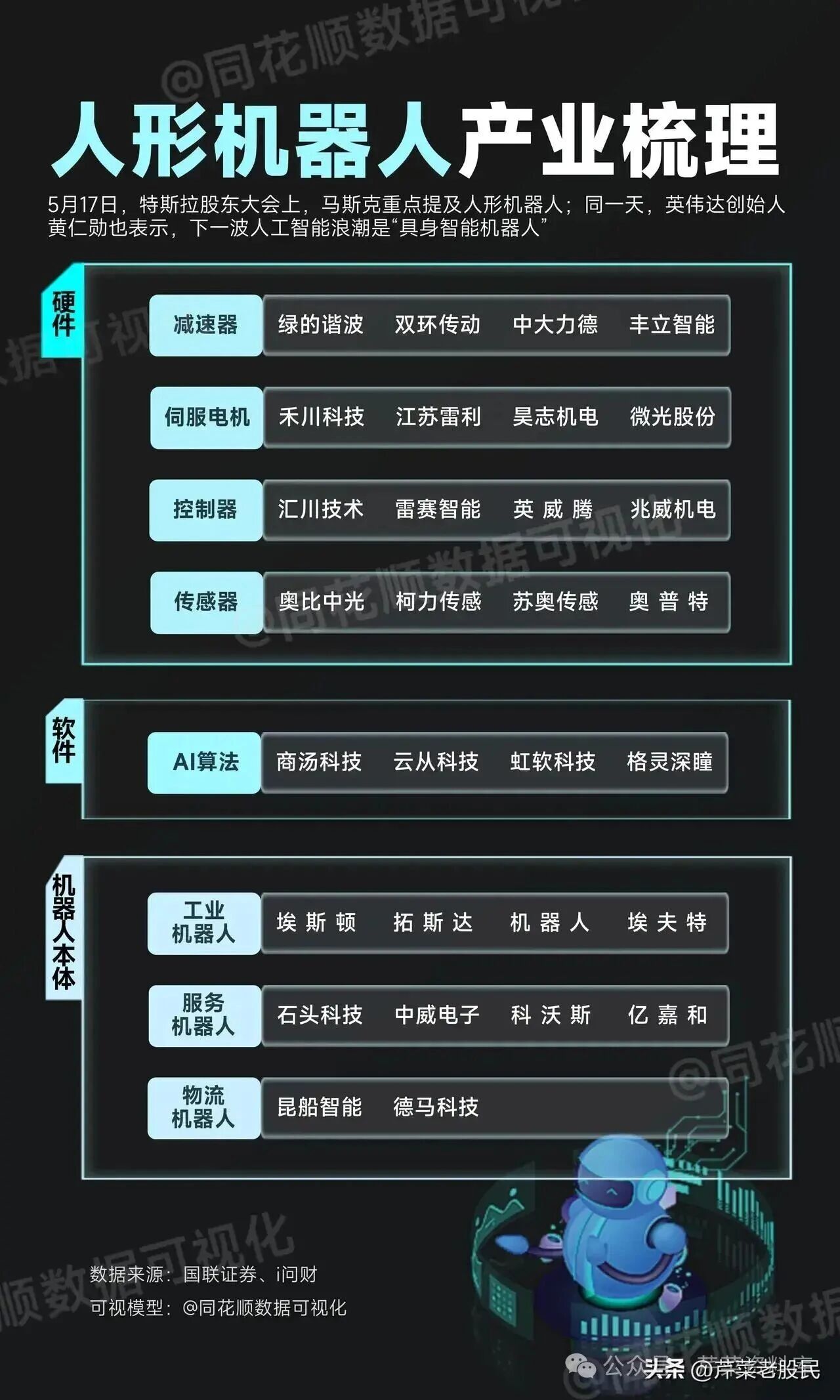 OCR:IMG:人形机器人产业梳理 5月17日,特斯拉股东大会上,马斯克重点提及人形机器人;同一天,英伟达创始人 黄仁勋也表示,下一波人工智能浪潮是“具身智能机器人 硬件 减速器 绿的谐波 双环传动 中大力德 丰立智能 伺服电机 禾川科技 江苏雷利 昊志机电 微光股份 控制器 汇川技术 雷赛智能 英威腾 兆威机电 传感器 奥比中光 柯力传感 苏奥传感 奥普特 软件 AI算法 商汤科技 云从科技 虹软科技 格灵深瞳 机器人本体 工业 埃斯顿 拓斯达 机器人 埃夫特 机器人 服务 石头科技 中威电子 机器人 科沃斯 亿嘉和 物流 机器人 昆船智能 德马科技 视代 数据来源:国联证券、问财 顺数 可视模型:@同花顺数据可视化 公众头条芹菜老股民