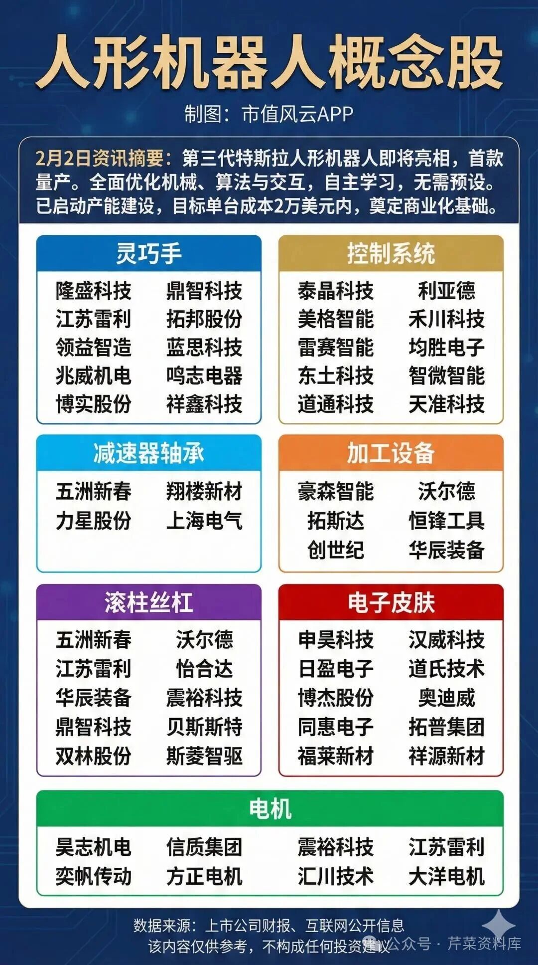 OCR:IMG:人形机器人概念股 制图:市值风云APP 2月2日资讯摘要:第三代特斯拉人形机器人即将亮相,首款 量产。全面优化机械、算法与交互,自主学习,无需预设。 已启动产能建设,目标单台成本2万美元内,奠定商业化基础。 灵巧手 控制系统 隆盛科技 鼎智科技 泰晶科技 利亚德 江苏雷利 拓邦股份 美格智能 禾川科技 领益智造 蓝思科技 雷赛智能 均胜电子 兆威机电 鸣志电器 东土科技 智微智能 博实股份 祥鑫科技 道通科技 天准科技 减速器轴承 加工设备 五洲新春 翔楼新材 豪森智能 沃尔德 力星股份 上海电气 拓斯达 恒锋工具 创世纪 华辰装备 滚柱丝杠 电子皮肤 五洲新春 沃尔德 申昊科技 汉威科技 江苏雷利 怡合达 日盈电子 道氏技术 华辰装备 震裕科技 博杰股份 奥迪威 鼎智科技 贝斯斯特 同惠电子 拓普集团 双林股份 斯菱智驱 福莱新材 祥源新材 电机 昊志机电 信质集团 震裕科技 江苏雷利 奕帆传动 方正电机 汇川技术 大洋电机 数据来源:上市公司财报、互联网公开信息 该内容仅供参考,不构成任何投资建议公众号·芹菜资料库