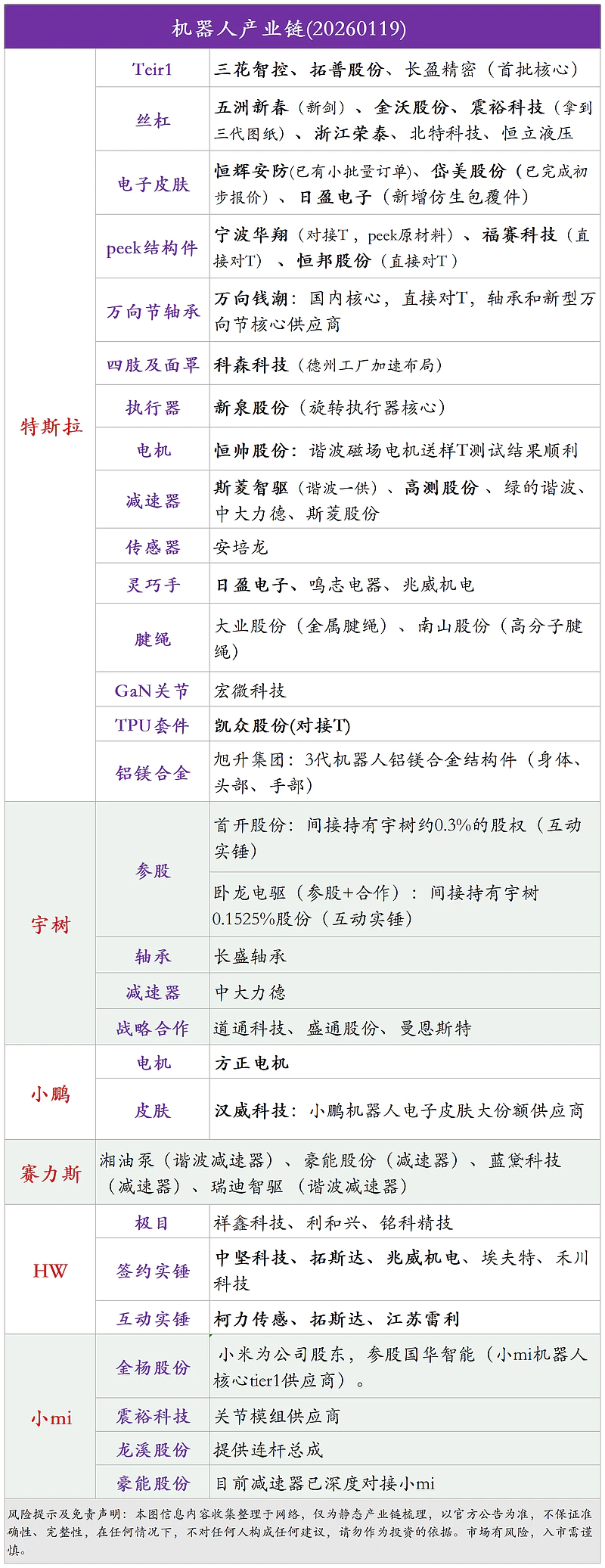 OCR:IMG:机器人产业链(20260119) Teir1 三花智控、拓普股份、长盈精密(首批核心) 五洲新春(新剑)、金沃股份、震裕科技(拿到 丝杠 三代图纸)、浙江荣泰、北特科技、恒立液压 恒辉安防(已有小批量订单)、岱美股份(已完成初 电子皮肤 步报价)、日盈电子(新增仿生包覆件) 宁波华翔(对接T,pcek原材料)、福赛科技(直 peek结构件 接对T)、恒邦股份(直接对T) 万向钱潮:国内核心,直接对T,轴承和新型万 万向节轴承 向节核心供应商 四肢及面罩 科森科技(德州工厂加速布局) 执行器 新泉股份(旋转执行器核心) 特斯拉 电机 恒帅股份:谐波磁场电机送样T测试结果顺利 斯菱智驱(谐波一供)、高测股份、绿的谐波、 减速器 中大力德、斯菱股份 传感器 安培龙 灵巧手 日盈电子、鸣志电器、兆威机电 大业股份(金属腱绳)、南山股份(高分子腱 腱绳 绳) GaN关节 宏微科技 TPU套件 凯众股份(对接T) 旭升集团:3代机器人铝镁合金结构件(身体、 铝镁合金 头部、手部) 首开股份:间接持有宇树约0.3%的股权(互动 实锤) 参股 卧龙电驱(参股+合作):间接持有宇树 宇树 0.1525%股份(互动实锤) 轴承 长盛轴承 减速器 中大力德 战略合作 道通科技、盛通股份、曼恩斯特 电机 方正电机 小鹏 皮肤 汉威科技:小鹏机器人电子皮肤大份额供应商 湘油泵(谐波减速器)、豪能股份(减速器)、蓝黛科技 赛力斯 (减速器)、瑞迪智驱(谐波减速器) 极目 祥鑫科技、利和兴、铭科精技 中坚科技、拓斯达、兆威机电、埃夫特、禾川 HW 签约实锤 科技 互动实锤 柯力传感、拓斯达、江苏雷利 小米为公司股东,参股国华智能(小mi机器人 金杨股份 核心tier1供应商)。 小mi 震裕科技 关节模组供应商 龙溪股份 提供连杆总成 豪能股份 目前减速器已深度对接小mi 风险提示及免责声明:本图信息内容收集整理于网络,仅为静态产业链梳理,以官方公告为准,不保证准 确性、完整性,在任何情况下,不对任何人构成任何建议,请勿作为投资的依据。市场有风险,入市需谨 慎。