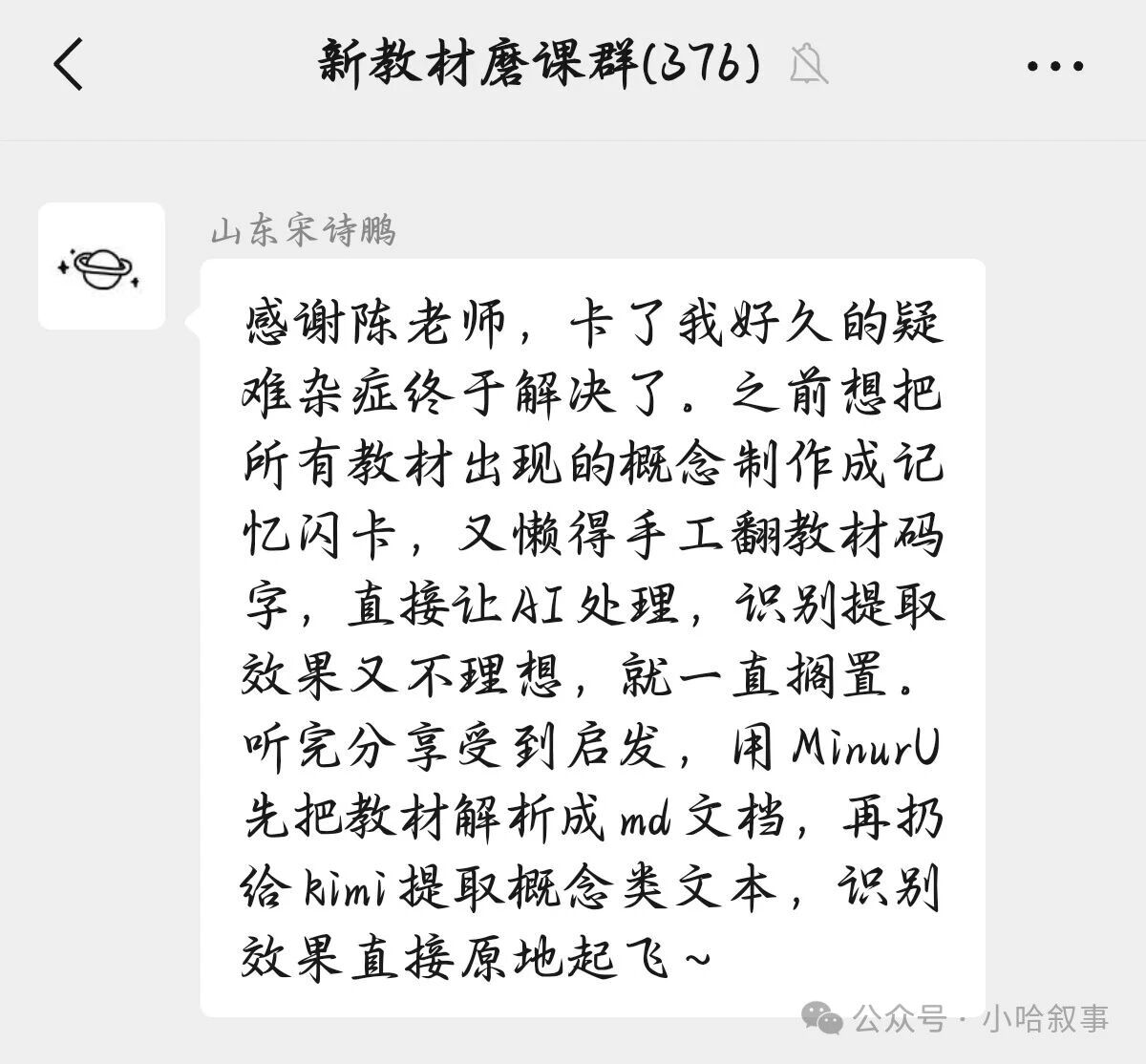 新教材磨课群376) 山东宋诗鹏 感谢陈老师,卡了我好久的疑 难杂症终手解决了。之前想把 所有教材出现的概念制作成记 忆闪卡,又懒得手工翻教材码 学,直接让/处理,识别提取 效果又不理想,就一直搁置。 听完分享受到启发,Miur 先把教材解折成md文挡,再扔 给kimi提取概念类文本,识别 效果直接原地起飞~ #公众号·小哈叙事