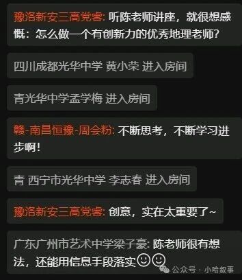 像洛新安一高党睿听陈老师讲座,就很想感 概:怎么做一个有创新力的优秀地理老师? 四川成都光华中学黄小荣进入房间 青光华中学孟学梅进入房间 赣南昌恒豫-周会粉:不断思考,不断学习进 步啊! 青西宁市光华中学李志春进入房间 豫洛新安三高党睿创意,实在太重要了, 广东广州市艺术中学梁子豪:陈老师很有想 法,还能用信息手段落实?④ 公众号。小哈叙事