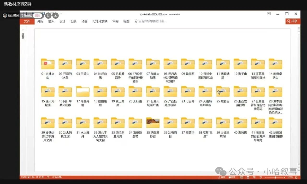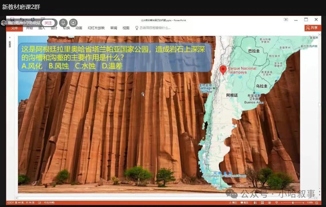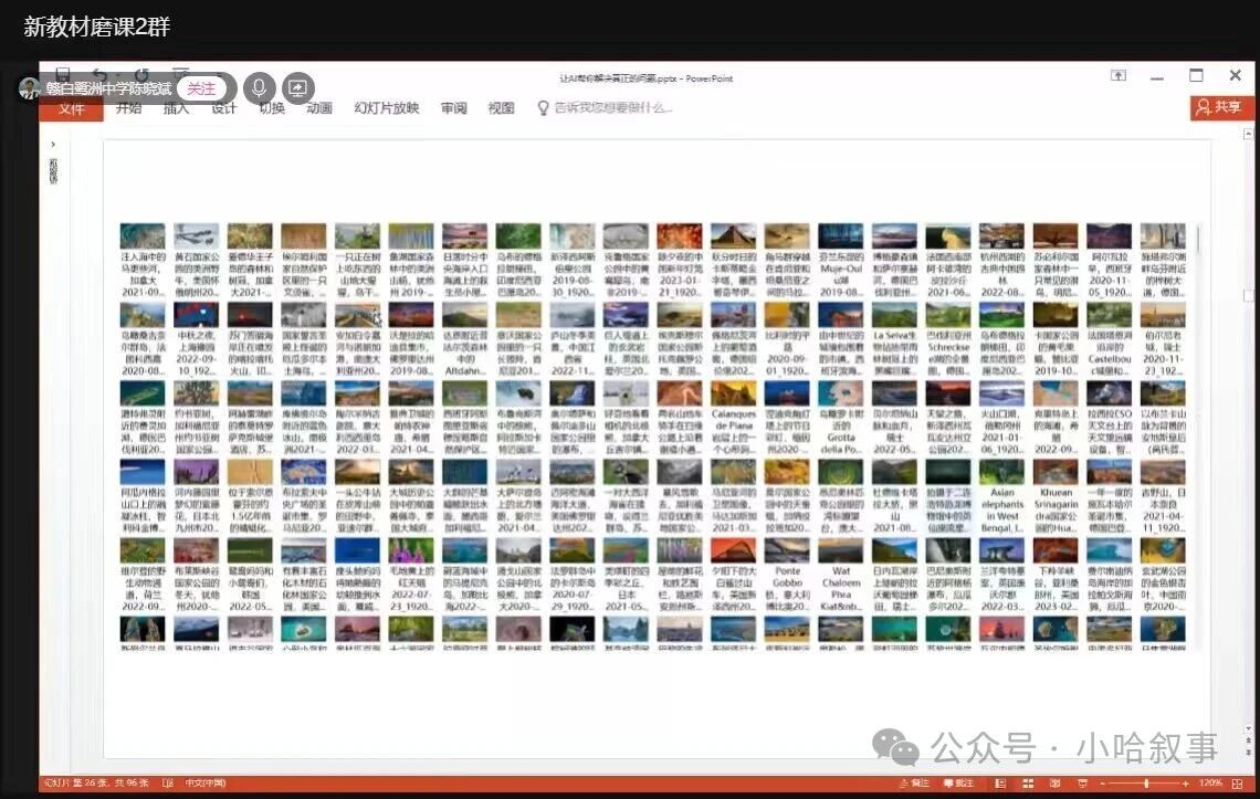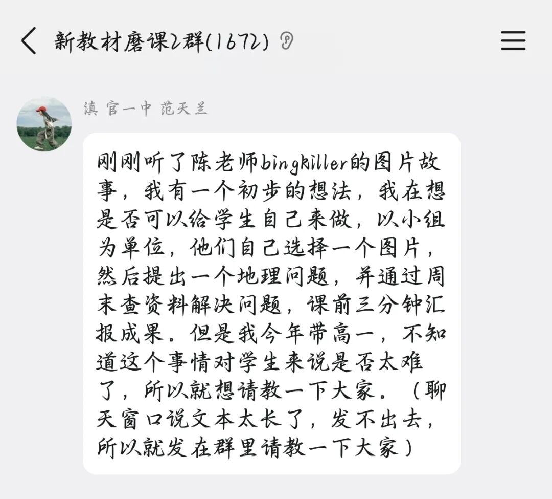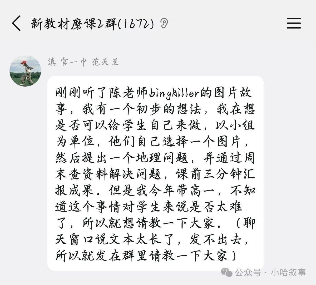 新教材磨课2群(1672)? 三 滇官一中范天兰 刚刚听了陈老师bingkiler的图片故 事,我有一个初步的想法,我在想 是否可以给学生自己来做,以小组 为单位,他们自己选择一个图片, 然后提出一个地理问题,并通过周 末查资料解决问题,课前三分钟汇 报成果,但是我今年带高一,不知 道这个事情对学生来说是否太难 了,所以就想请教一下大家。(聊 天窗口说文本太长了,发不出去, 所以就发在群里请教一下大家) 公众号·小哈叙事
