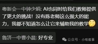 粤新会一中钟少娟:AI也同时给我们教师提供 了更大的挑战!没有陈老师这么强大的能 力,我都不知道怎么让它来辅助我的教学 鲁济一中曹小晨:好专业 f公众号·小哈叙事