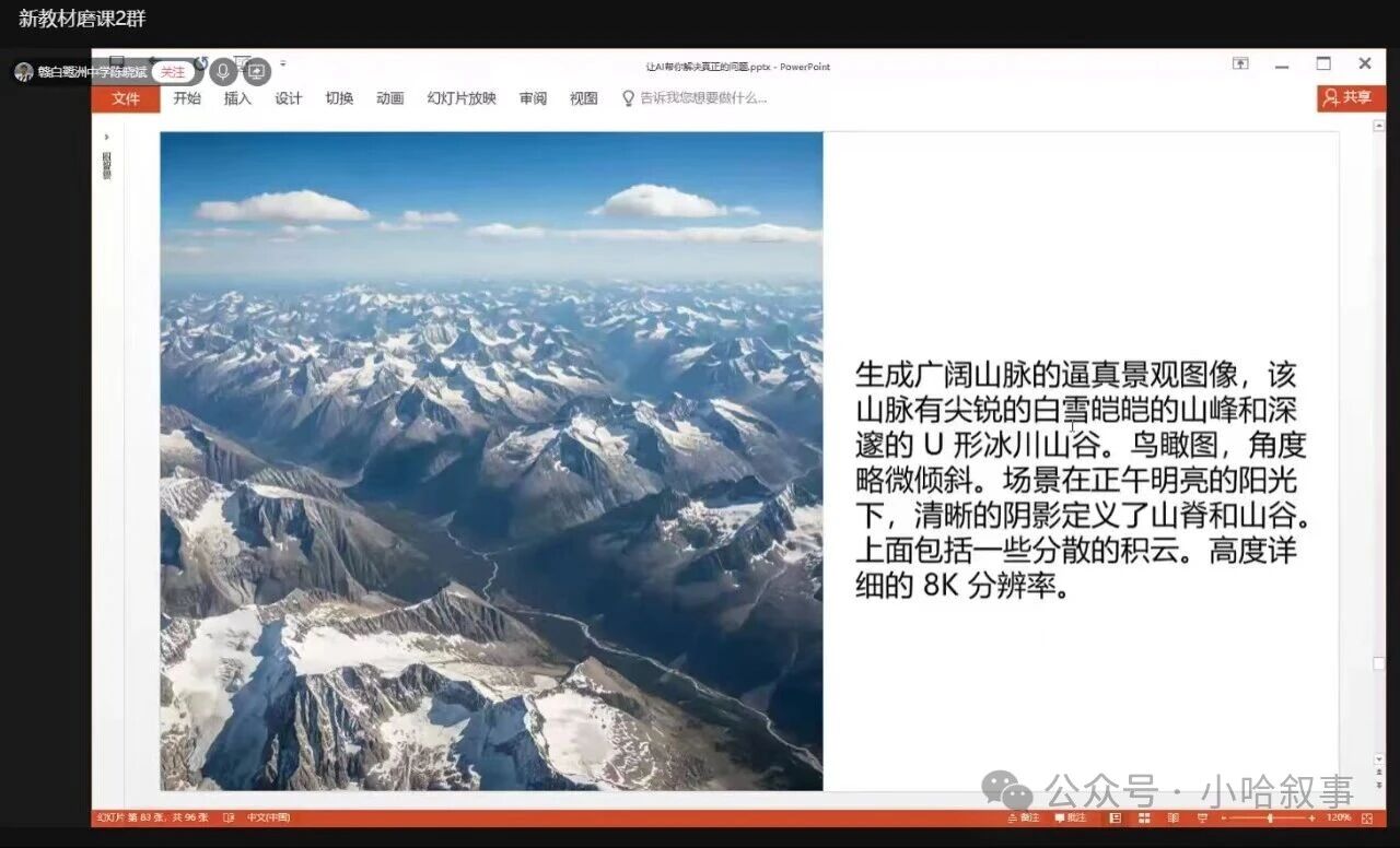 新教材课2群 幻灯片放身 生成广阔山脉的逼真景观图像,该 山脉有尖锐的白雪皓皓的山峰和深 邃的U形冰川山谷。鸟瞰图,角度 略微倾斜。场景在正午明亮的阳光 下,清晰的阴影定义了山脊和山谷 上面包括一些分散的积云。高度详 细的8K分辨率。 #公众号·小哈叙事