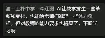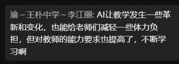 渝~王朴中学~李江丽:AI让教学发生一些革 新和变化,也能给老师们减轻一些体力负 担,但对教师的能力要求也提高了,不断学 习啊