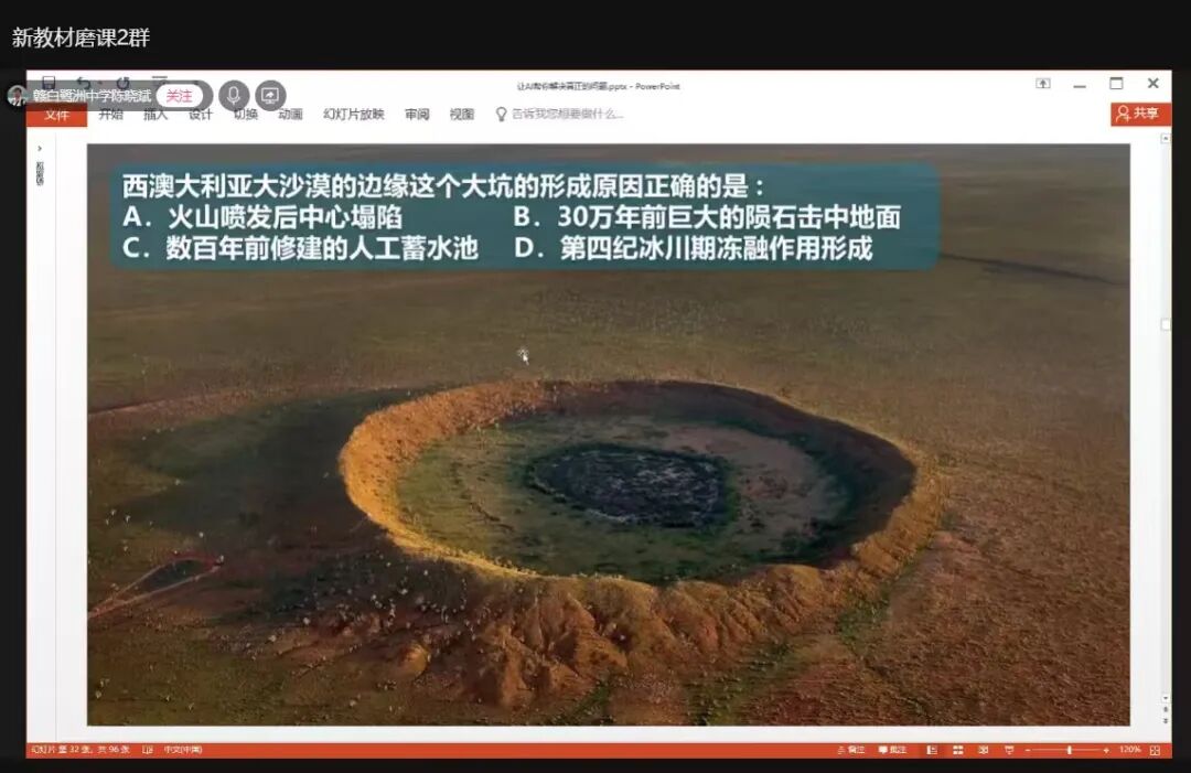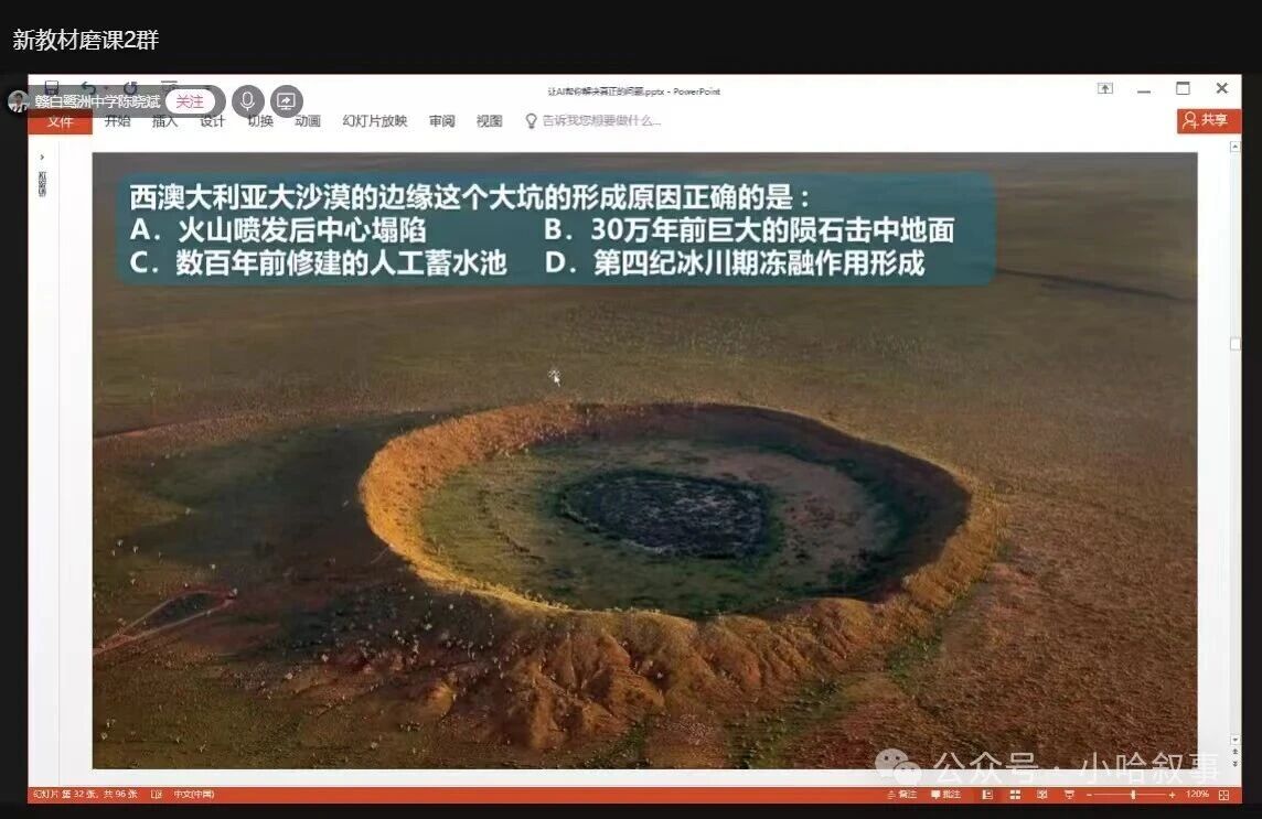 新教材磨课2群 灯灯片故粉 西澳大利亚大沙漠的边缘这个大坑的形成原因正确的是: A,火山喷发后中心陷 B.30万年前巨大的陨石击中地面 ,数百年前修建的人工蓄水池 D.第四纪冰川期冻融作用形成