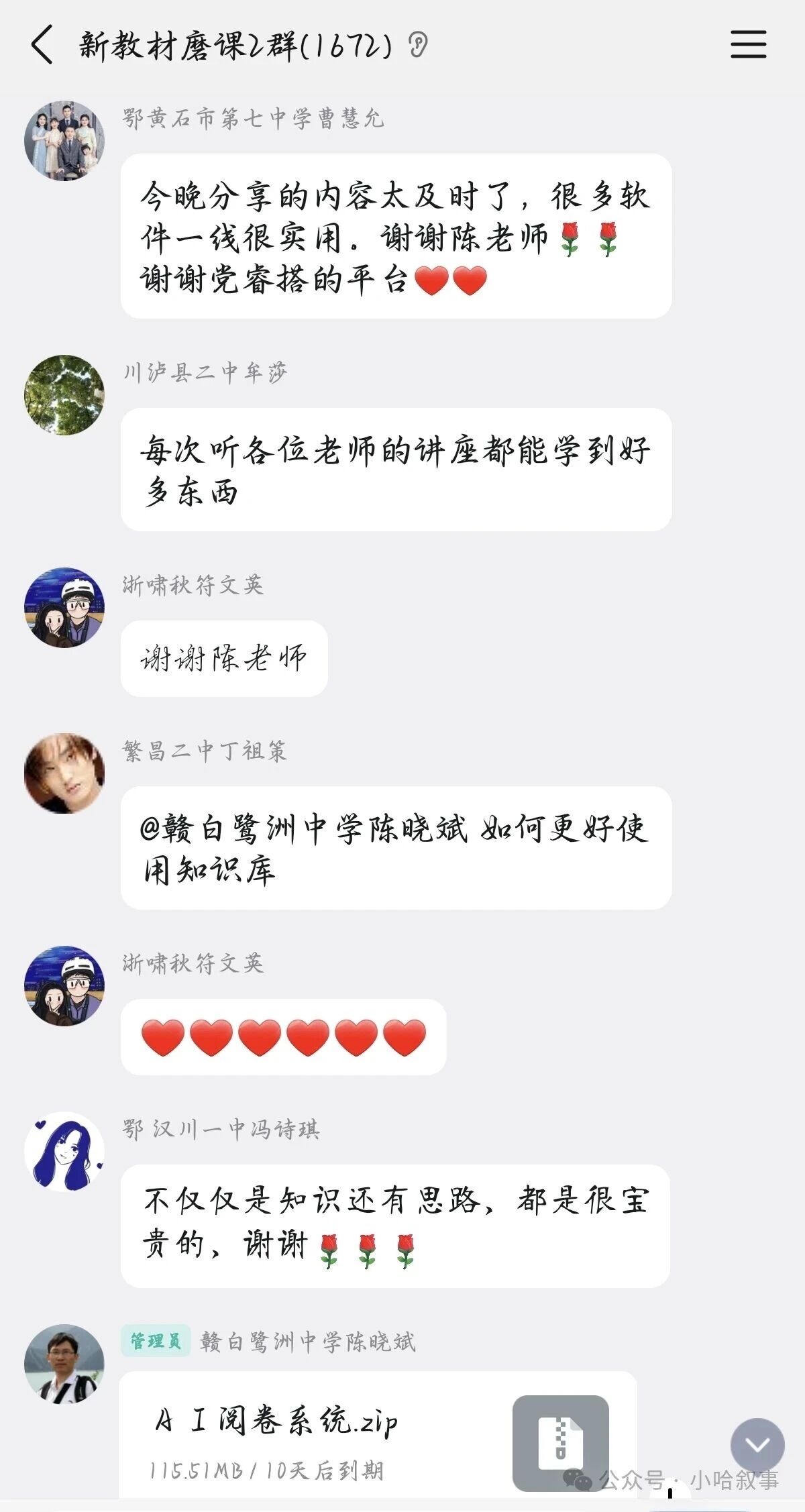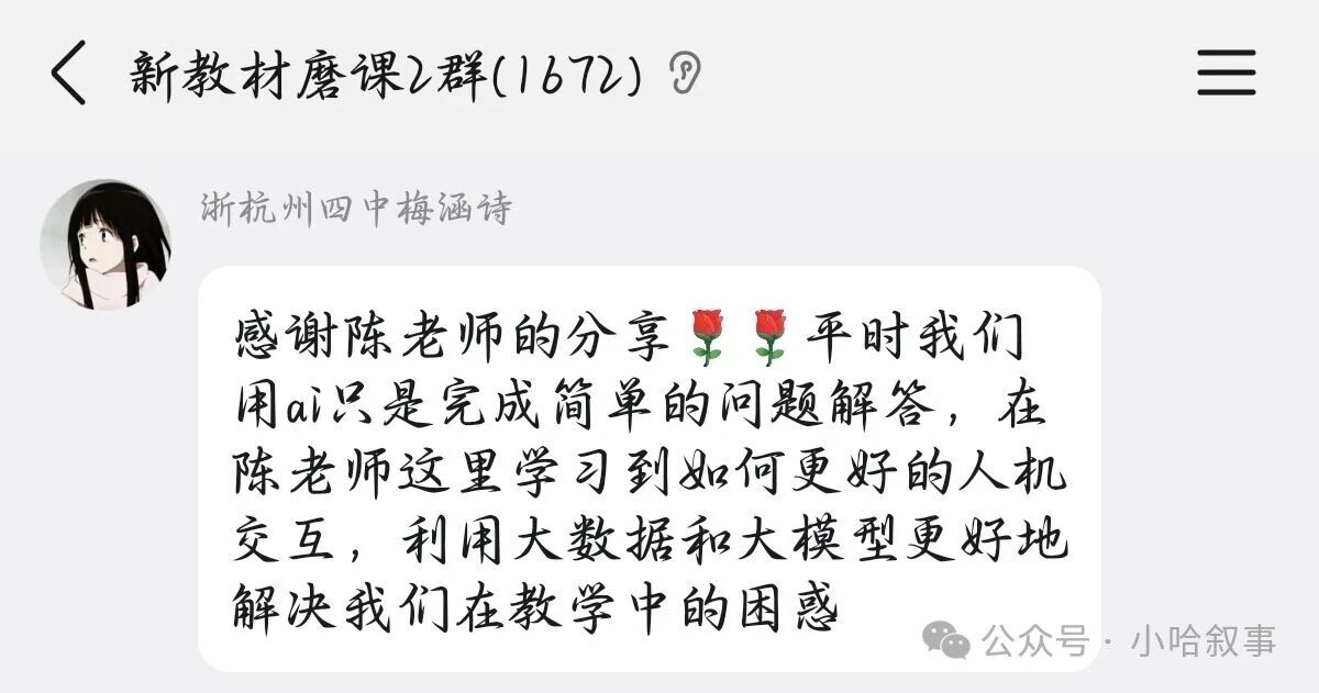 新教材磨课2群(1672)? 三 浙杭州四中梅涵诗 感谢陈老师的分享量更平时我们 用α是完成简单的问题解答,在 除老师这里学习到如何更好的人机 交互,利闭大数据和大模型更好地 解决我们在教学中的困惑 e公众号·小哈叙事