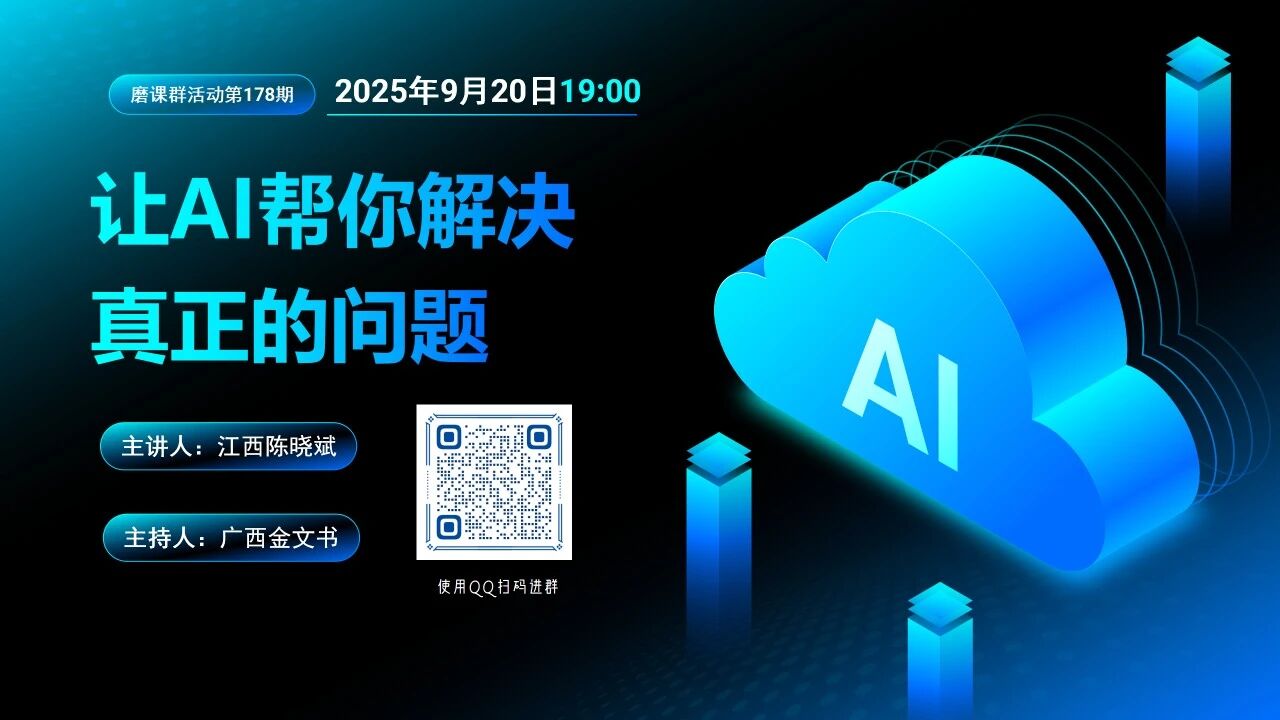 磨课群活动第178期 2025年9月20日19:00 让AI帮你解决 真正的问题 AI 主讲人:江西陈晓斌 主持人:广西金文书 使用QQ扫鸡进器