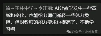 渝~王朴中学~李江丽:A让教学发生一些革 新和变化,也能给老师们减轻一些体力负 担,但对教师的能力要求也提高了,不断学 习啊 #公众号:小哈教事