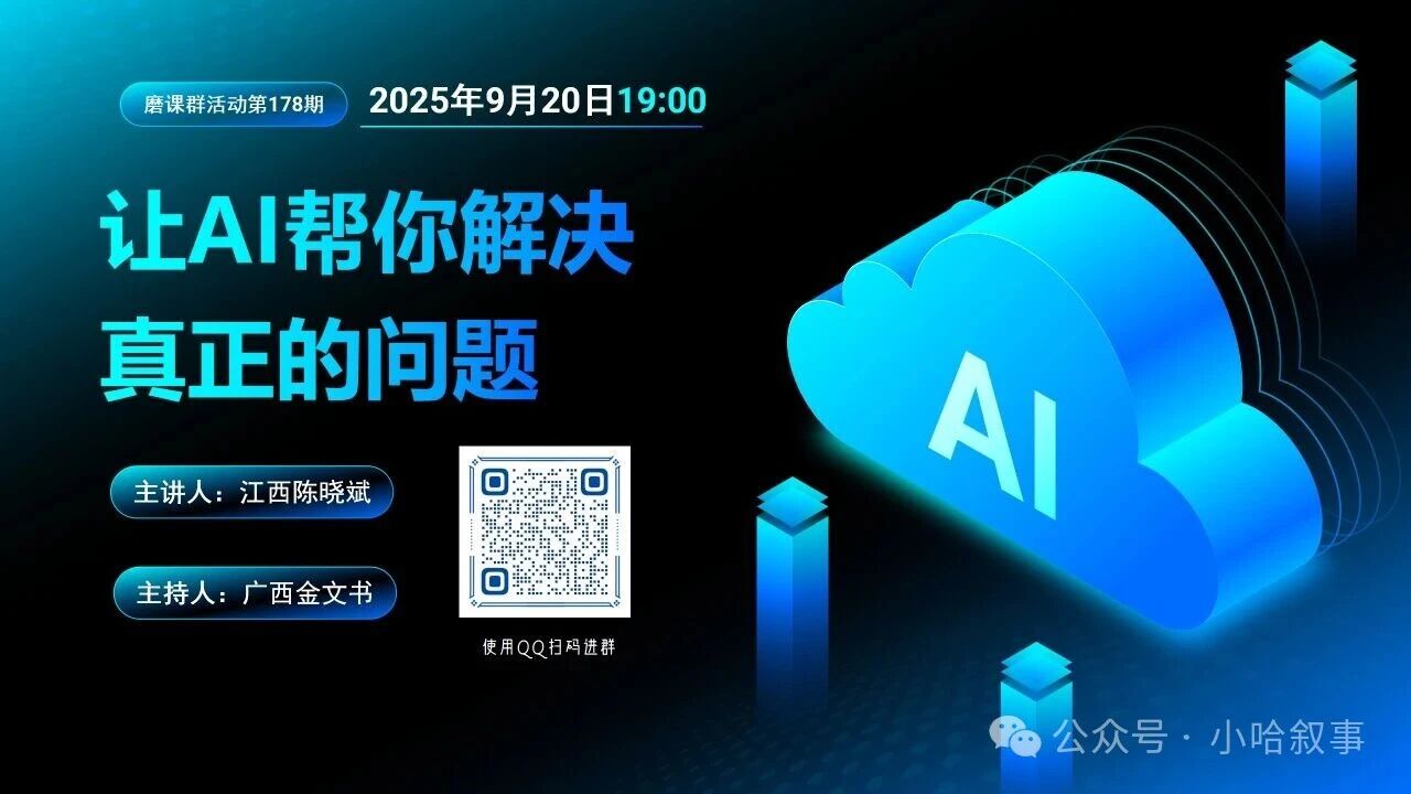 磨课群活动第178期 2025年9月20日19:00 让AI帮你解决 真正的问题 AI 主讲人:江西陈晓斌 主持人:广西金文书 使用QQ扫鸡温群 #公众号·小哈叙事