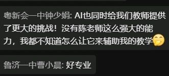 粤新会一中钟少娟:AI也同时给我们教师提供 了更大的挑战!没有陈老师这么强大的能 力,我都不知道怎么让它来辅助我的教学 鲁济一中曹小晨:好专业