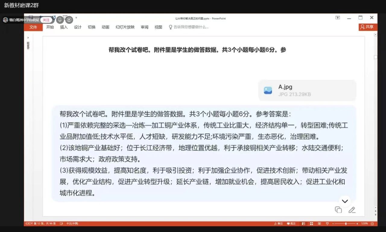陈老师分享了他用AI做的四件事:写适合高中生的校本地理读本;做阅卷助手;优化“图问地理”的趣味思维活动;成为地理专业方向的好工具。