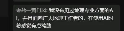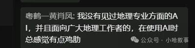 粤鹤一黄肖凤:我没有见过地理专业方面的A ,并且面向广大地理工作者的,在使用AI时 总感觉有点鸡肋 ##公众号·小哈叙事