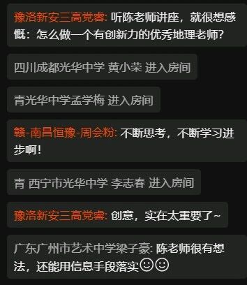 像洛新安一高党睿听陈老师讲座,就很想感 概:怎么做一个有创新力的优秀地理老师? 四川成都光华中学黄小荣进入房间 青光华中学孟学梅进入房间 赣-南昌恒豫-周会粉:不断思考,不断学习进 步啊! 青西宁市光华中学 李志春进入房间 豫洛新安三高党睿:创意,实在太重要了 广东广州市艺术中学梁子豪陈老师很有想 法,还能用信息手段落实?@
