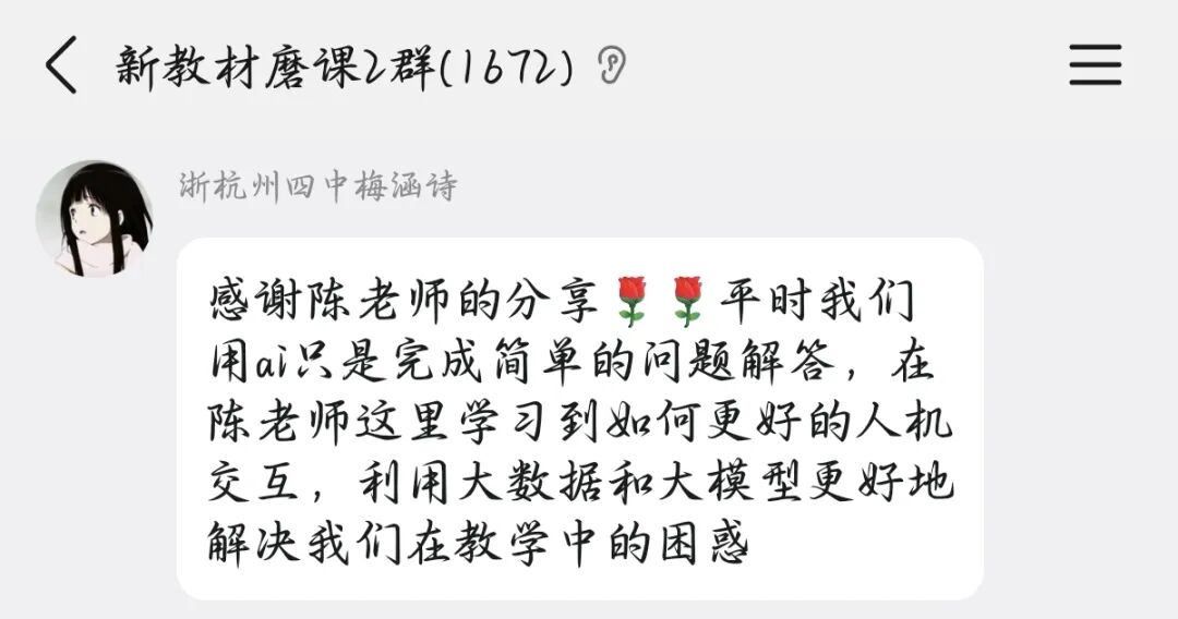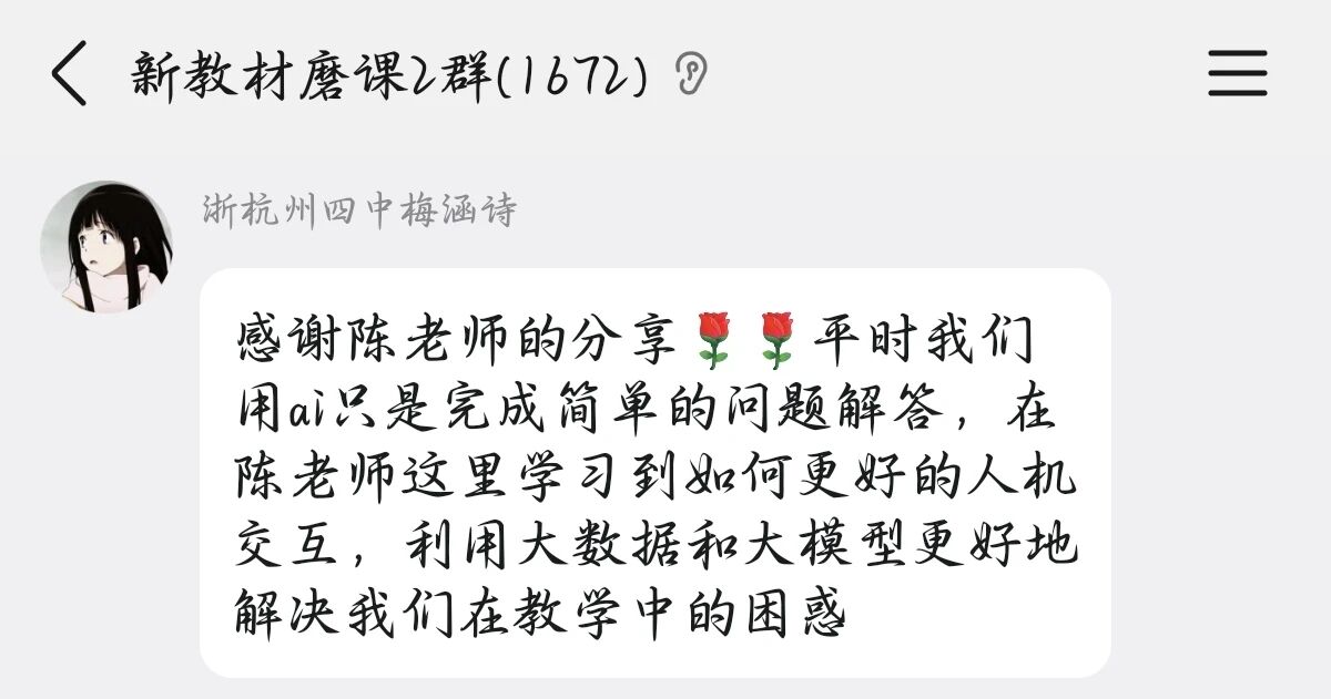 新教材磨课2群(1672)? 三 浙杭州四中梅涵诗 感谢陈老师的分享要至平时我们 用只是完成简单的问题解答,在 陈老师这里学习到如何更好的人机 交互,利闭大数据和大模型更好地 解决我们在教学中的困惑