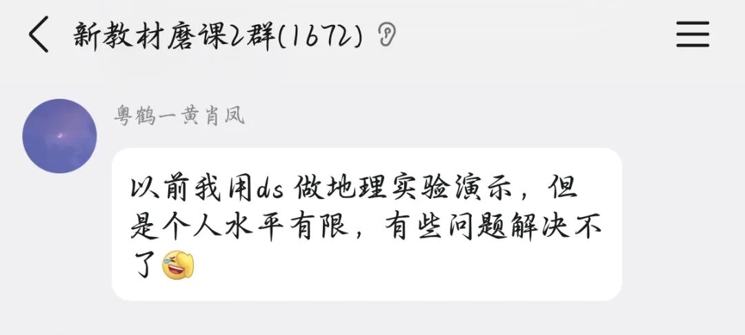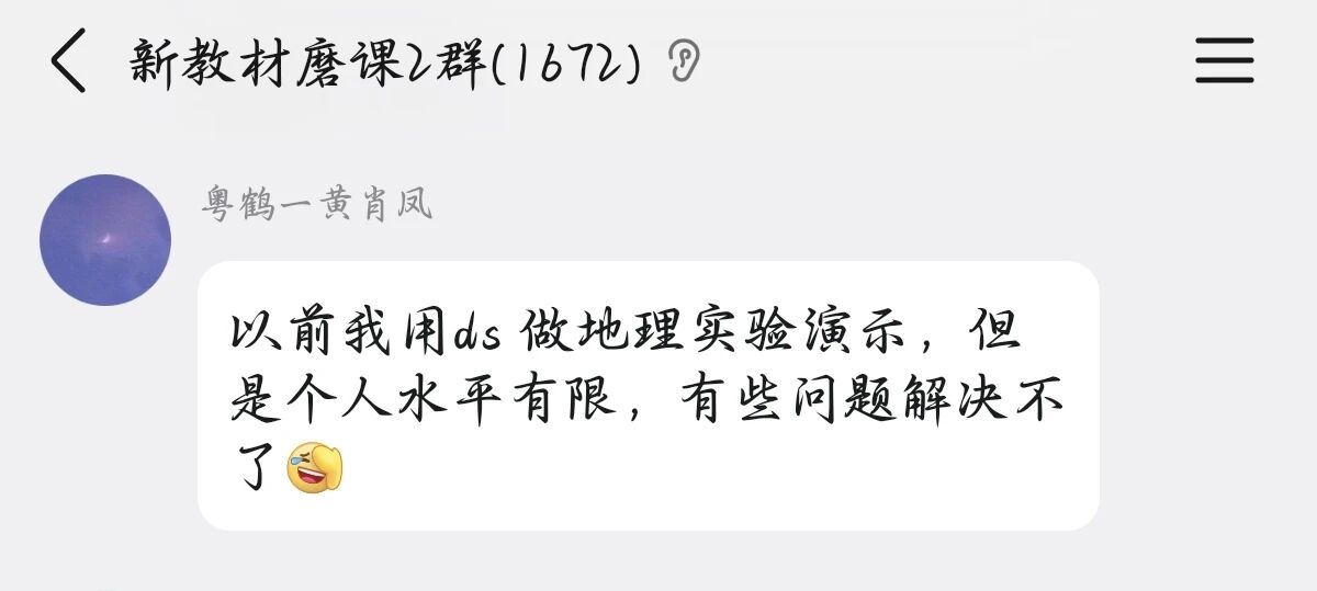 新教材磨课2群(1672)? 三 粤鹤一黄肖凤 以前我闲ds做地理实验演示,但 是个人水华有限,有些问题解决不 了