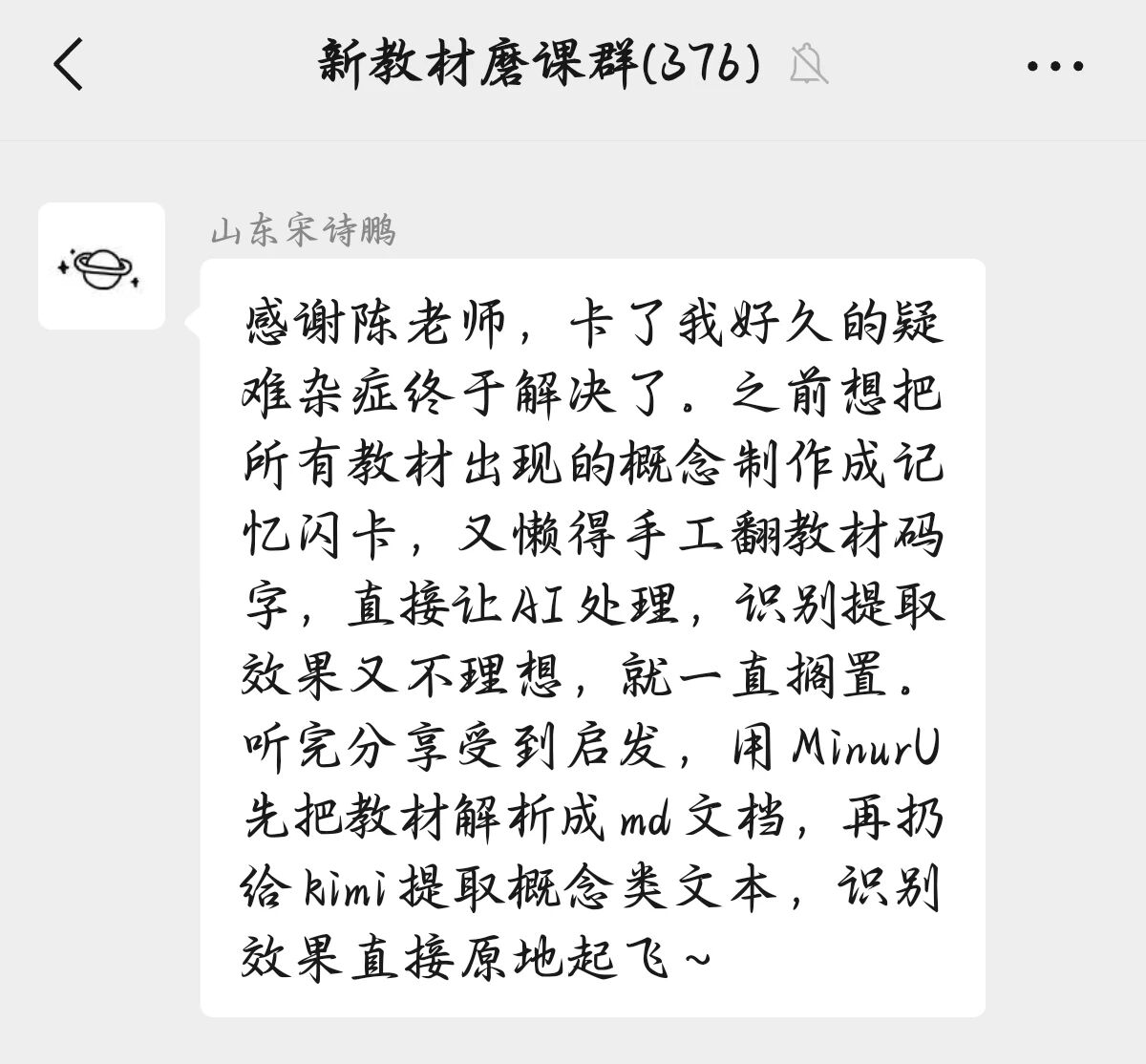 新教材磨课群(376)内 山东宋诗鹏 感谢陈老师,卡了我好久的疑 难杂症终手解决了。之前想把 听有教材出现的概念制作成记 忆闪卡,又懒得手工翻教材码 学,直接让处理,识别提取 效果又不理想,就一直搁置。 听完分享受到启发,闲MiurU 先把教材解折成md文挡,再扔 给kimi提取概念类父本,识别 效果直接原地起飞~