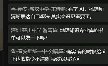 鲁泰安-新汶中学宋诗鹏:有了AI,梳理和 清晰表达自己想法其实变得更重要了。 深圳燕川中学游雪璟地理知识专业库的书 单可以发一下吗? 鲁-泰安肥城一中-刘晨曦:确实有的时候给ai 下达的指令不清晰导致没用好ai