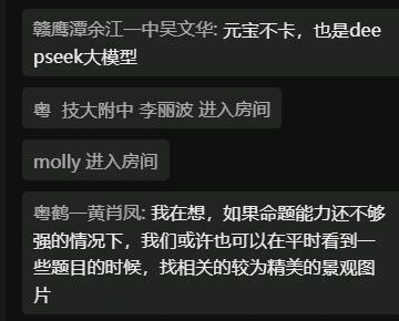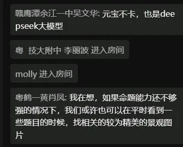 赣鹰潭余江一中吴文华:元宝不卡,也是dee pseek大模型 粤 技大附中李丽波进入房间 molly进入房间 粤鹤一黄肖凤:我在想,如果命题能力还不够 强的情况下,我们或许也可以在平时看到 些题目的时候,找相关的较为精美的景观图 片
