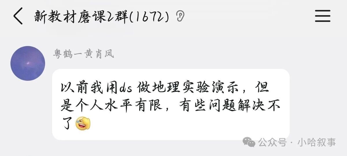 新教材磨课群(1672)② 三 粤鹤一黄肖凤 以前我闲ds做地理实验演示,但 是个人水平有限,有些问题解决不 了日 #公众号·小哈叙事
