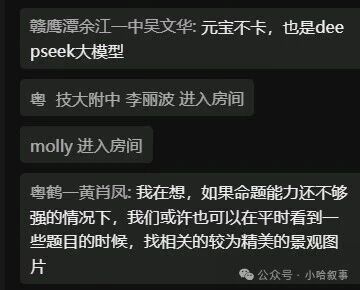 赣鹰潭余江一中吴文华元宝不卡,也是dee pseek大模型 粤技大附中李丽波进入房间 molly进入房间 粤鹤一黄肖凤:我在想,如果命题能力还不够 强的情况下,我们或许也可以在平时看到一 些题目的时候,找相关的较为精美的景观图 片 #公众号.小哈教事