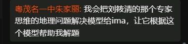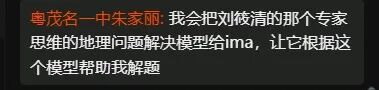 粤茂名一中朱家丽:我会把刘筱清的那个专家 思维的地理问题解决模型给ima,让它根据这 个模型帮助我解题