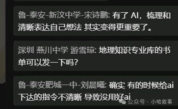 鲁-泰安-新汶中学宋诗鹏:有了AI,梳理和 清晰表达自己想法其实变得更重要了。 深圳燕川中学游雪琼地理知识专业库的书 单可以发一下吗? 鲁-泰安肥城一中-刘晨曦:确实有的时候给ai 下达的指令不清晰导致没用好aj 公众号小哈事