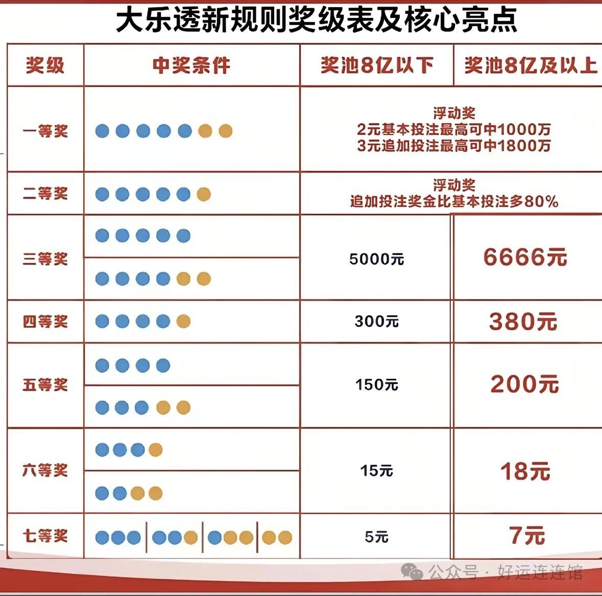 OCR:IMG:大乐透新规则奖级表及核心亮点 奖级 中奖条件 奖池8亿以下 奖池8亿及以上 浮动奖 等奖 2元基本投注最高可中1000万 3元追加投注最高可中1800万 二等奖 浮动奖 追加投注奖金比基本投注多80% 三等奖 5000元 6666元 四等奖 300元 380元 福 福 150元 200元 五等奖 六等奖 15元 18元 七等奖 5元 7元 公众号:好运连连