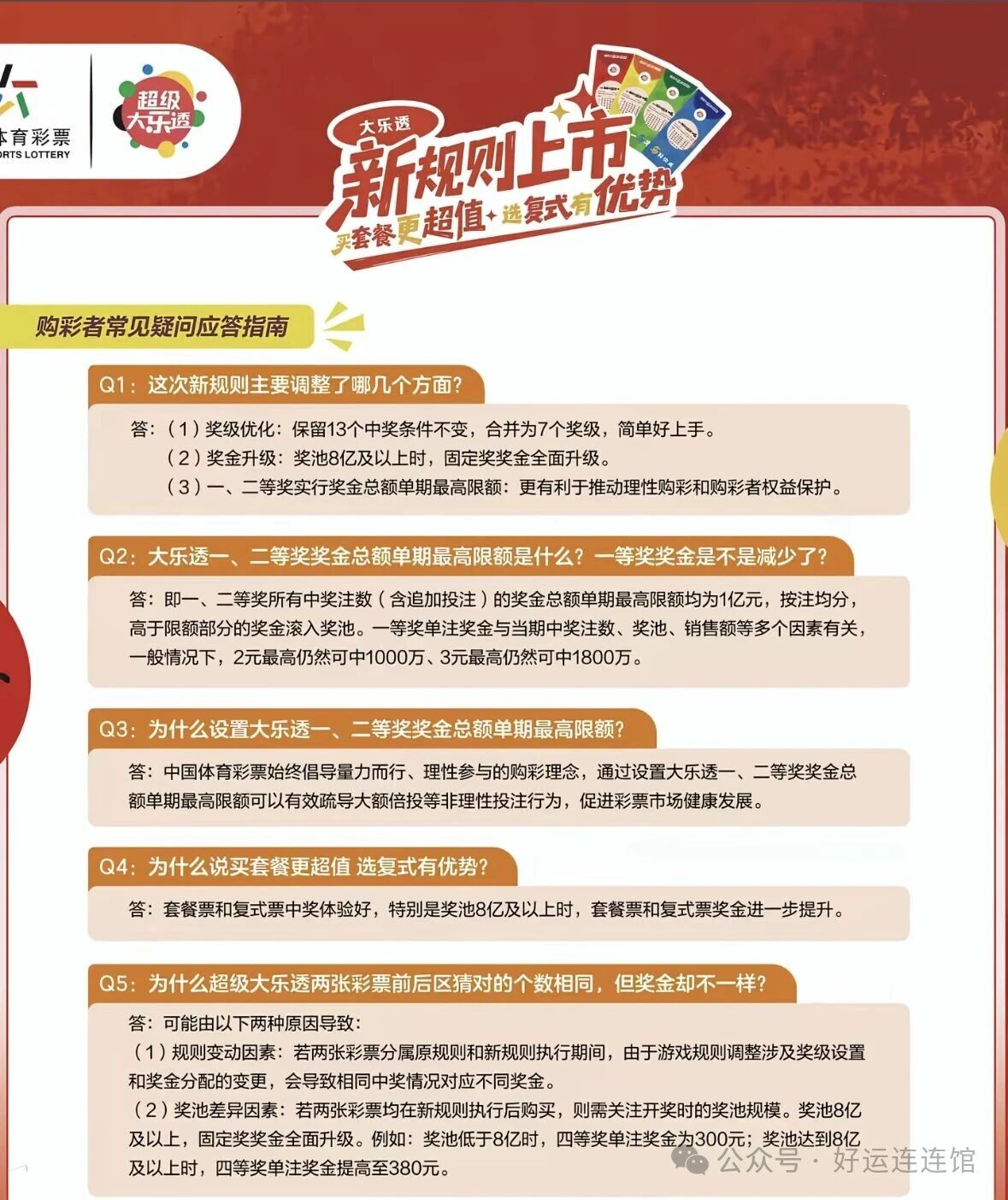 OCR:IMG:六 超级 大乐透 上市 本育彩票 大乐透 福 SRTSLOTTERY 新规则 购彩者常见疑问应答指南 Q1:这次新规则主要调整了哪几个方面? 答:(1)奖级优化:保留13个中奖条件不变,合并为7个奖级,简单好上手。 (2)奖金升级:奖池8亿及以上时,固定奖奖金全面升级。 (3)一、二等奖实行奖金总额单期最高限额:更有利于推动理性购彩和购彩者权益保护。 Q2:大乐透一、二等奖奖金总额单期最高限额是什么?一等奖奖金是不是减少了? 答:即一、二等奖所有中奖注数(含追加投注)的奖金总额单期最高限额均为1亿元,按注均分, 高于限额部分的奖金滚入奖池。一等奖单注奖金与当期中奖注数、奖池、销售额等多个因素有关, 一般情况下,2元最高仍然可中1000方、3元最高仍然可中1800方。 Q3:为什么设置大乐透一、二等奖奖金总额单期最高限额? 答:中国体育彩票始终倡导量力而行、理性参与的购彩理念,通过设置大乐透一、二等奖奖金总 额单期最高限额可以有效疏导大额倍投等非理性投注行为,促进彩票市场健康发展。 Q4:为什么说买套餐更超值选复式有优势? 答:套餐票和复式票中奖体验好,特别是奖池8亿及以上时,套餐票和复式票奖金进一步提升。 Q5:为什么超级大乐透两张彩票前后区猜对的个数相同,但奖金却不一样? 答:可能由以下两种原因导致: (1)规则变动因素:若两张彩票分属原规则和新规则执行期间,由于游戏规则调整涉及奖级设置 和奖金分配的变更,会导致相同中奖情况对应不同奖金。 (2)奖池差异因素:若两张彩票均在新规则执行后购买,则需关注开奖时的奖池规模。奖池8亿 及以上,固定奖奖金全面升级。例如:奖池低于8亿时,四等奖单注奖金为300元;奖池达到8亿 及以上时,四等奖单注奖金提高至380元。
