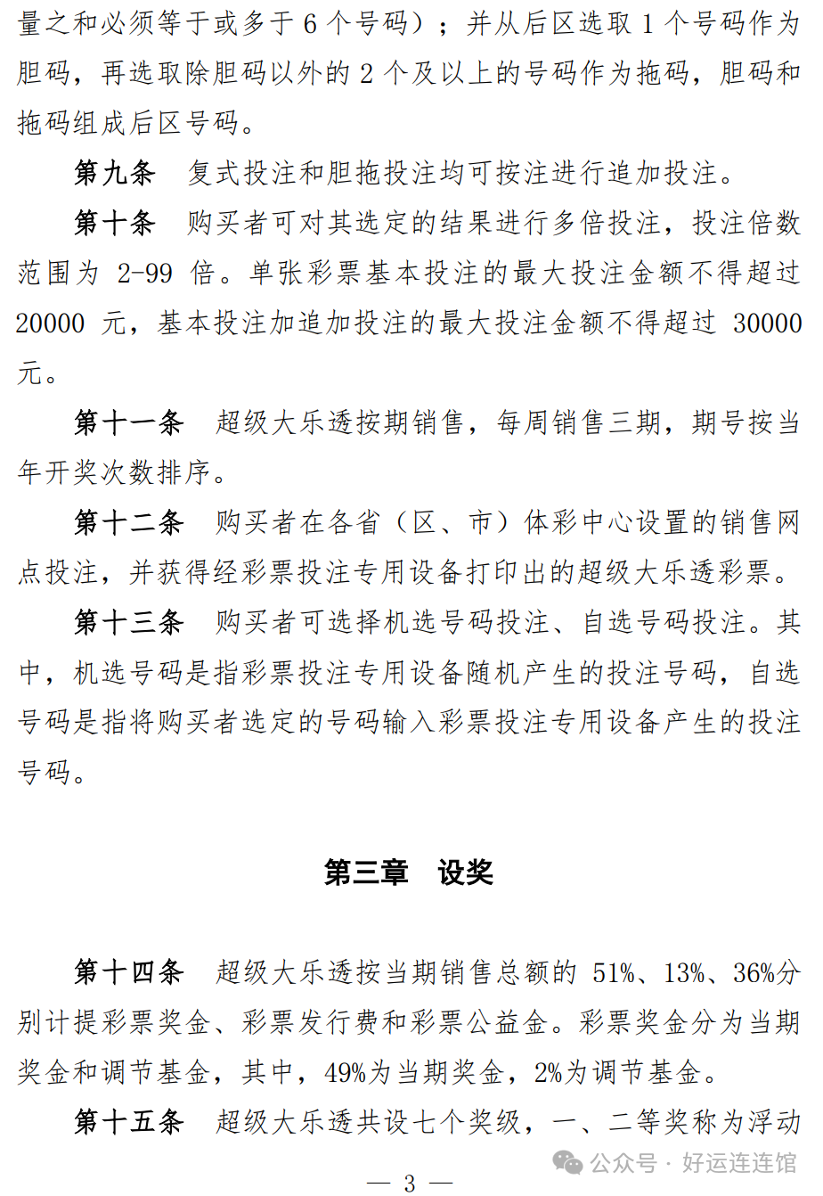 OCR:IMG:量之和必须等于或多于6个号码);并从后区选取1个号码作为 胆码,再选取除胆码以外的2个及以上的号码作为拖码,胆码和 拖码组成后区号码。 第九条复式投注和胆拖投注均可按注进行追加投注。 第十条购买者可对其选定的结果进行多倍投注,投注倍数 范围为2-99倍。单张彩票基本投注的最大投注金额不得超过 20000元,基本投注加追加投注的最大投注金额不得超过30000 元。 第十一条超级大乐透按期销售,每周销售三期,期号按当 年开奖次数排序。 第十二条购买者在各省(区、市)体彩中心设置的销售网 点投注,并获得经彩票投注专用设备打印出的超级大乐透彩票。 第十三条购买者可选择机选号码投注、自选号码投注。其 中,机选号码是指彩票投注专用设备随机产生的投注号码,自选 号码是指将购买者选定的号码输入彩票投注专用设备产生的投注 号码。 第三章设奖 第十四条超级大乐透按当期销售总额的51%、13%、36%分 别计提彩票奖金、彩票发行费和彩票公益金。彩票奖金分为当期 奖金和调节基金,其中,49%为当期奖金,2%为调节基金。 第十五条超级大乐透共设七个奖级,一、二等奖称为浮动 公众号·好运连连馆 -3—