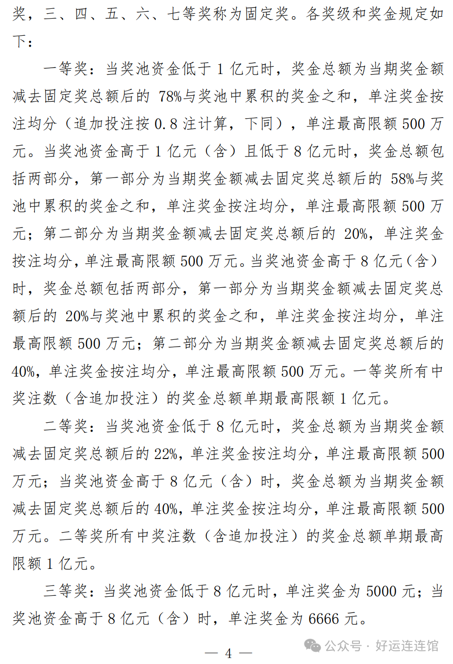 OCR:IMG:奖,三、四、五、六、七等奖称为固定奖。各奖级和奖金规定如 下: 一等奖:当奖池资金低于1亿元时,奖金总额为当期奖金额 减去固定奖总额后的78%与奖池中累积的奖金之和,单注奖金按 注均分(追加投注按0.8注计算,下同),单注最高限额500万 元。当奖池资金高于1亿元(含)且低于8亿元时,奖金总额包 括两部分,第一部分为当期奖金额减去固定奖总额后的58%与奖 池中累积的奖金之和,单注奖金按注均分,单注最高限额500万 元;第二部分为当期奖金额减去固定奖总额后的20%,单注奖金 按注均分,单注最高限额500万元。当奖池资金高于8亿元(含) 时,奖金总额包括两部分,第一部分为当期奖金额减去固定奖总 额后的20%与奖池中累积的奖金之和,单注奖金按注均分,单注 最高限额500万元;第二部分为当期奖金额减去固定奖总额后的 40%,单注奖金按注均分,单注最高限额500万元。一等奖所有中 奖注数(含追加投注)的奖金总额单期最高限额1亿元。 二等奖:当奖池资金低于8亿元时,奖金总额为当期奖金额 减去固定奖总额后的22%,单注奖金按注均分,单注最高限额500 万元;当奖池资金高于8亿元(含)时,奖金总额为当期奖金额 减去固定奖总额后的40%,单注奖金按注均分,单注最高限额500 万元。二等奖所有中奖注数(含追加投注)的奖金总额单期最高 限额1亿元。 三等奖:当奖池资金低于8亿元时,单注奖金为5000元;当 奖池资金高于8亿元(含)时,单注奖金为6666元。 公众号·好运连连馆 一4一