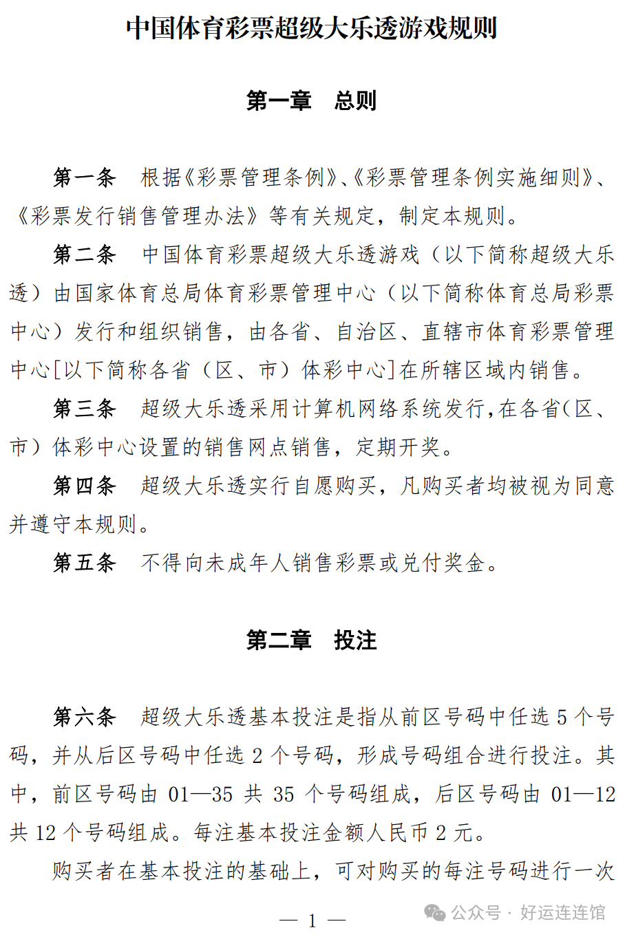OCR:IMG:中国体育彩票超级大乐透游戏规则 第一章总则 第一条根据《彩票管理条例》、《彩票管理条例实施细则》、 《彩票发行销售管理办法》等有关规定,制定本规则。 第二条中国体育彩票超级大乐透游戏(以下简称超级大乐 透)由国家体育总局体育彩票管理中心(以下简称体育总局彩票 中心)发行和组织销售,由各省、自治区、直辖市体育彩票管理 中心[以下简称各省(区、市)体彩中心]在所辖区域内销售。 第三条超级大乐透采用计算机网络系统发行,在各省(区、 市)体彩中心设置的销售网点销售,定期开奖。 第四条超级大乐透实行自愿购买,凡购买者均被视为同意 并遵守本规则。 第五条不得向未成年人销售彩票或兑付奖金。 第二章投注 第六条超级大乐透基本投注是指从前区号码中任选5个号 码,并从后区号码中任选2个号码,形成号码组合进行投注。其 中,前区号码由01一35共35个号码组成,后区号码由01一12 共12个号码组成。每注基本投注金额人民币2元。 购买者在基本投注的基础上,可对购买的每注号码进行一次 公众号·好运连连馆