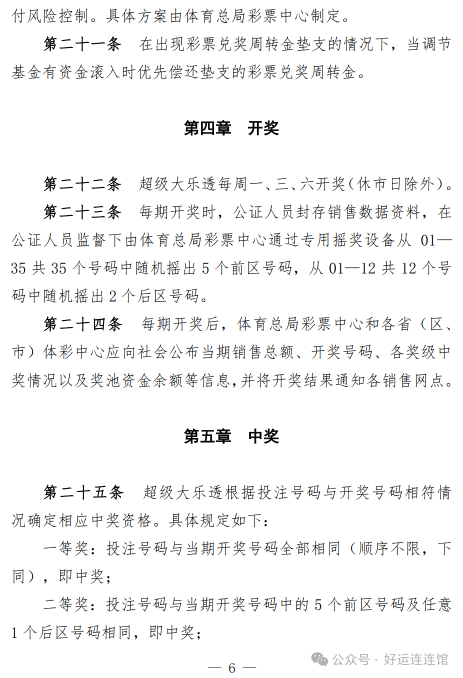 OCR:IMG:付风险控制。具体方案由体育总局彩票中心制定。 第二十一条在出现彩票兑奖周转金垫支的情况下,当调节 基金有资金滚入时优先偿还垫支的彩票兑奖周转金。 第四章开奖 第二十二条超级大乐透每周一、三、六开奖(休市日除外)。 第二十三条每期开奖时,公证人员封存销售数据资料,在 公证人员监督下由体育总局彩票中心通过专用摇奖设备从01一 35共35个号码中随机摇出5个前区号码,从01一12共12个号 码中随机摇出2个后区号码。 第二十四条每期开奖后,体育总局彩票中心和各省(区、 市)体彩中心应向社会公布当期销售总额、开奖号码、各奖级中 奖情况以及奖池资金余额等信息,并将开奖结果通知各销售网点。 第五章中奖 第二十五条超级大乐透根据投注号码与开奖号码相符情 况确定相应中奖资格。具体规定如下: 一等奖:投注号码与当期开奖号码全部相同(顺序不限,下 同),即中奖; 二等奖:投注号码与当期开奖号码中的5个前区号码及任意 1个后区号码相同,即中奖; 公众号·好运连连馆 一6一