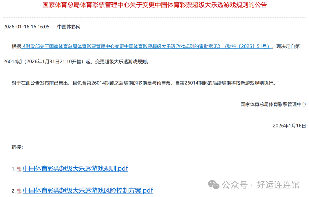 OCR:IMG:国家体育总局体育彩票管理中心关于变更中国体育彩票超级大乐透游戏规则的公告 2026-01-16 16:16:05 中国体彩网 根据《财政部关于国家体育总局体育彩票管理中心变更中国体育彩票超级大乐透游戏规则的审批意见》(财综【2025】51号),现决定自第 26014期(2026年1月31日21:10开售)起,变更超级大乐透游戏规则。 对于在此公告发布前已售出、且包含第26014期或之后奖期的多期票与预售票,自第26014期起的后续奖期将按新游戏规则执行。 国家体育总局体育彩票管理中心 2026年1月16日 链接: 1.中国体育彩票超级大乐透游戏规则pdf 公众号·好运连连馆 2.中国体育彩票超级大乐透游戏风险控制方案pdf
