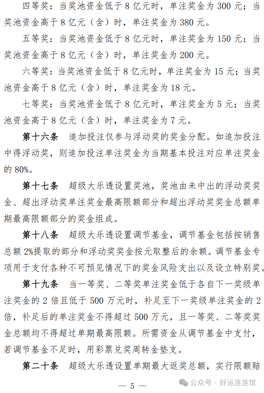 OCR:IMG:四等奖:当奖池资金低于8亿元时,单注奖金为300元;当 奖池资金高于8亿元(含)时,单注奖金为380元。 五等奖:当奖池资金低于8亿元时,单注奖金为150元;当 奖池资金高于8亿元(含)时,单注奖金为200元。 六等奖:当奖池资金低于8亿元时,单注奖金为15元;当奖 池资金高于8亿元(含)时,单注奖金为18元。 七等奖:当奖池资金低于8亿元时,单注奖金为5元;当奖 池资金高于8亿元(含)时,单注奖金为7元。 第十六条追加投注仅参与浮动奖的奖金分配。如追加投注 中得浮动奖,则追加投注单注奖金为当期基本投注对应单注奖金 的80%。 第十七条超级大乐透设置奖池,奖池由未中出的浮动奖奖 金、超出浮动奖单注奖金最高限额部分和超出浮动奖奖金总额单 期最高限额部分的奖金组成。 第十八条超级大乐透设置调节基金,调节基金包括按销售 总额2%提取的部分和浮动奖奖金按元取整后的余额。调节基金专 项用于支付各种不可预见情况下的奖金风险支出以及设立特别奖 第十九条当一等奖、二等奖单注奖金低于各自下一奖级单 注奖金的2倍且低于500万元时,补足至下一奖级单注奖金的2 倍,补足后的单注奖金不得超过500万元,且一等奖、二等奖奖 金总额均不得超过单期最高限额。所需资金从调节基金中支付, 若调节基金不足时,用彩票兑奖周转金垫支。 第二十条超级大乐透设置单期最大返奖总额,实行限额赔 一5一 公众号·好运连连馆