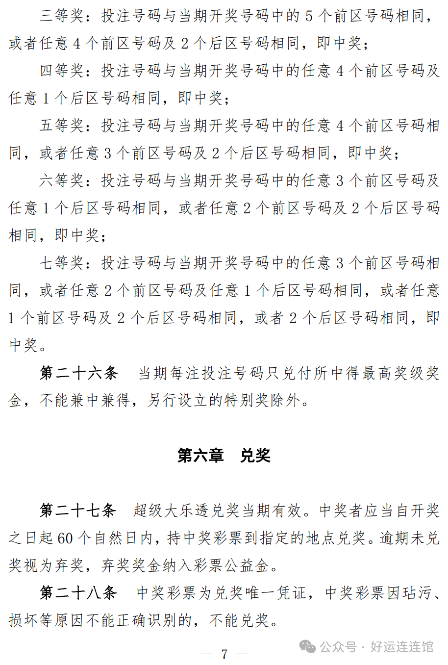 OCR:IMG:三等奖:投注号码与当期开奖号码中的5个前区号码相同, 或者任意4个前区号码及2个后区号码相同,即中奖; 四等奖:投注号码与当期开奖号码中的任意4个前区号码及 任意1个后区号码相同,即中奖; 五等奖:投注号码与当期开奖号码中的任意4个前区号码相 同,或者任意3个前区号码及2个后区号码相同,即中奖; 六等奖:投注号码与当期开奖号码中的任意3个前区号码及 任意1个后区号码相同,或者任意2个前区号码及2个后区号码 相同,即中奖; 七等奖:投注号码与当期开奖号码中的任意3个前区号码相 同,或者任意2个前区号码及任意1个后区号码相同,或者任意 1个前区号码及2个后区号码相同,或者2个后区号码相同,即 中奖。 第二十六条当期每注投注号码只兑付所中得最高奖级奖 金,不能兼中兼得,另行设立的特别奖除外。 第六章兑奖 第二十七条超级大乐透兑奖当期有效。中奖者应当自开奖 之日起60个自然日内,持中奖彩票到指定的地点兑奖。逾期未兑 奖视为弃奖,弃奖奖金纳入彩票公益金。 第二十八条中奖彩票为兑奖唯一凭证,中奖彩票因玷污、 损坏等原因不能正确识别的,不能兑奖。 公众号·好运连连馆 —7—