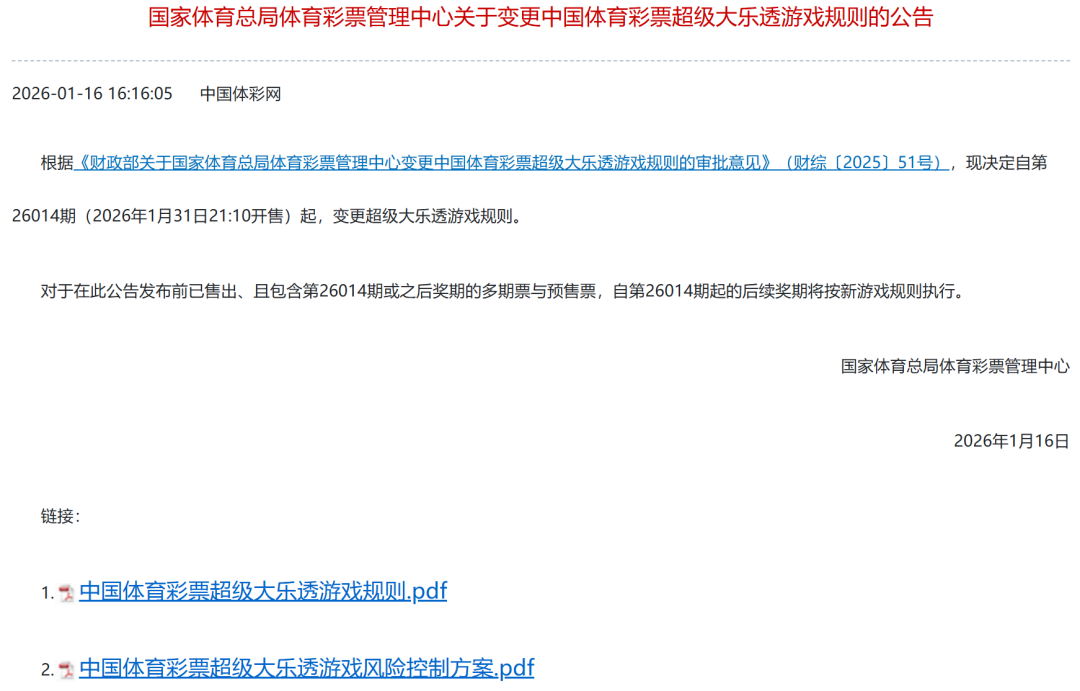 OCR:IMG:国家体育总局体育彩票管理中心关于变更中国体育彩票超级大乐透游戏规则的公告 2026-01-16 16:16:05 中国体彩网 根据《财政部关于国家体育总局体育彩票管理中心变更中国体育彩票超级大乐透游戏规则的审批意见》(财综【2025】51号),现决定自第 26014期(2026年1月31日21:10开售)起,变更超级大乐透游戏规则。 对于在此公告发布前已售出、且包含第26014期或之后奖期的多期票与预售票,自第26014期起的后续奖期将按新游戏规则执行。 国家体育总局体育彩票管理中心 2026年1月16日 链接: 1.中国体育彩票超级大乐透游戏规则pdf 2.中国体育彩票超级大乐透游戏风险控制方案pdf