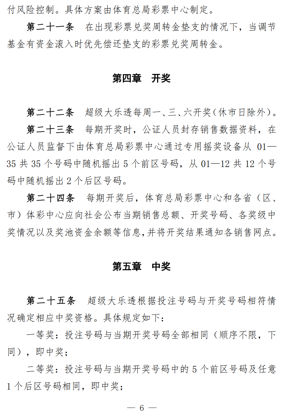 OCR:IMG:付风险控制。具体方案由体育总局彩票中心制定。 第二十一条在出现彩票兑奖周转金垫支的情况下,当调节 基金有资金滚入时优先偿还垫支的彩票兑奖周转金。 第四章开奖 第二十二条超级大乐透每周一、三、六开奖(休市日除外)。 第二十三条每期开奖时,公证人员封存销售数据资料,在 公证人员监督下由体育总局彩票中心通过专用摇奖设备从01一 35共35个号码中随机摇出5个前区号码,从01一12共12个号 码中随机摇出2个后区号码。 第二十四条每期开奖后,体育总局彩票中心和各省(区、 市)体彩中心应向社会公布当期销售总额、开奖号码、各奖级中 奖情况以及奖池资金余额等信息,并将开奖结果通知各销售网点。 第五章中奖 第二十五条超级大乐透根据投注号码与开奖号码相符情 况确定相应中奖资格。具体规定如下: 一等奖:投注号码与当期开奖号码全部相同(顺序不限,下 同),即中奖; 二等奖:投注号码与当期开奖号码中的5个前区号码及任意 1个后区号码相同,即中奖; -6一