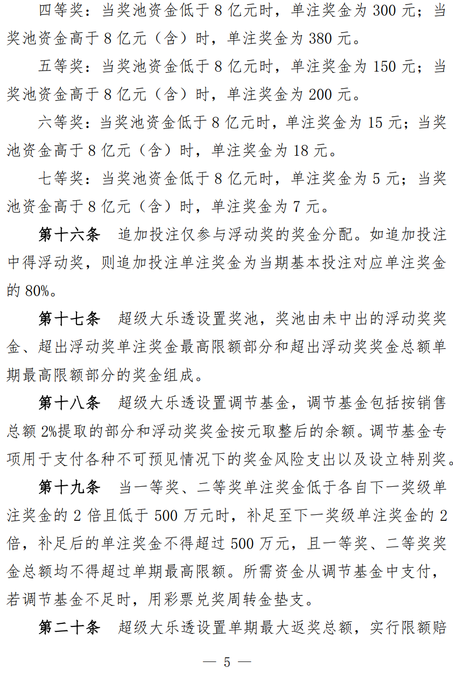 OCR:IMG:四等奖:当奖池资金低于8亿元时,单注奖金为300元;当 奖池资金高于8亿元(含)时,单注奖金为380元。 五等奖:当奖池资金低于8亿元时,单注奖金为150元;当 奖池资金高于8亿元(含)时,单注奖金为200元。 六等奖:当奖池资金低于8亿元时,单注奖金为15元;当奖 池资金高于8亿元(含)时,单注奖金为18元。 七等奖:当奖池资金低于8亿元时,单注奖金为5元;当奖 池资金高于8亿元(含)时,单注奖金为7元。 第十六条追加投注仅参与浮动奖的奖金分配。如追加投注 中得浮动奖,则追加投注单注奖金为当期基本投注对应单注奖金 的80%。 第十七条超级大乐透设置奖池,奖池由未中出的浮动奖奖 金、超出浮动奖单注奖金最高限额部分和超出浮动奖奖金总额单 期最高限额部分的奖金组成。 第十八条超级大乐透设置调节基金,调节基金包括按销售 总额2%提取的部分和浮动奖奖金按元取整后的余额。调节基金专 项用于支付各种不可预见情况下的奖金风险支出以及设立特别奖 第十九条当一等奖、二等奖单注奖金低于各自下一奖级单 注奖金的2倍且低于500万元时,补足至下一奖级单注奖金的2 倍,补足后的单注奖金不得超过500万元,且一等奖、二等奖奖 金总额均不得超过单期最高限额。所需资金从调节基金中支付, 若调节基金不足时,用彩票兑奖周转金垫支。 第二十条超级大乐透设置单期最大返奖总额,实行限额赔 一5一