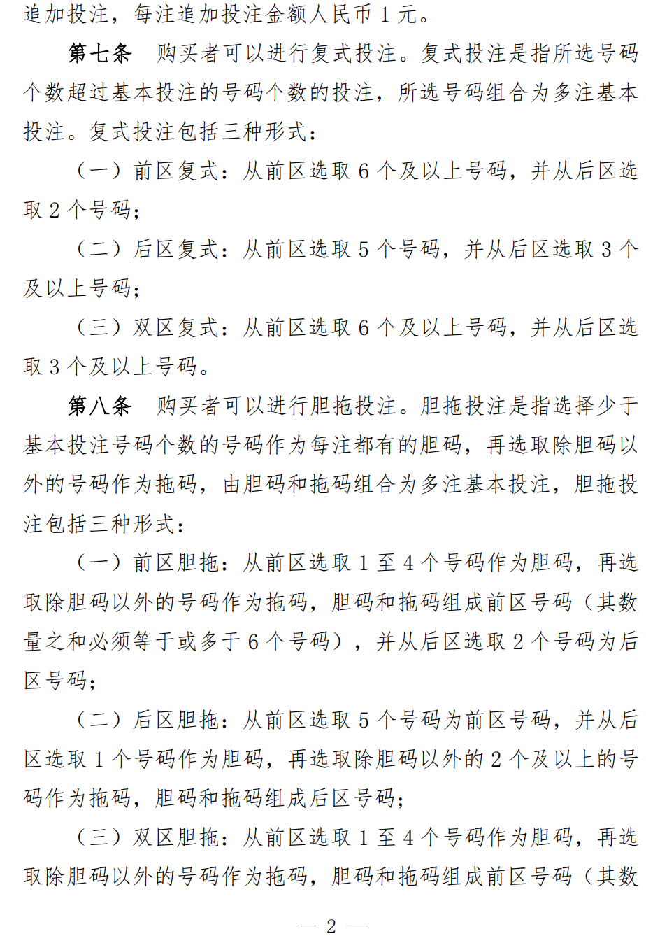 OCR:IMG:追加投注,每注追加投注金额人民币1元。 第七条购买者可以进行复式投注。复式投注是指所选号码 个数超过基本投注的号码个数的投注,所选号码组合为多注基本 投注。复式投注包括三种形式: (一)前区复式:从前区选取6个及以上号码,并从后区选 取2个号码; (二)后区复式:从前区选取5个号码,并从后区选取3个 及以上号码; (三)双区复式:从前区选取6个及以上号码,并从后区选 取3个及以上号码。 第八条购买者可以进行胆拖投注。胆拖投注是指选择少于 基本投注号码个数的号码作为每注都有的胆码,再选取除胆码以 外的号码作为拖码,由胆码和拖码组合为多注基本投注,胆拖投 注包括三种形式: (一)前区胆拖:从前区选取1至4个号码作为胆码,再选 取除胆码以外的号码作为拖码,胆码和拖码组成前区号码(其数 量之和必须等于或多于6个号码),并从后区选取2个号码为后 区号码; (二)后区胆拖:从前区选取5个号码为前区号码,并从后 区选取1个号码作为胆码,再选取除胆码以外的2个及以上的号 码作为拖码,胆码和拖码组成后区号码; (三)双区胆拖:从前区选取1至4个号码作为胆码,再选 取除胆码以外的号码作为拖码,胆码和拖码组成前区号码(其数 公众号·好运连连馆