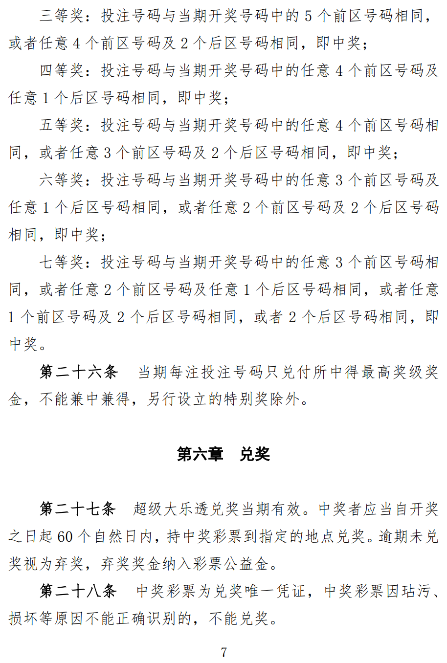 OCR:IMG:三等奖:投注号码与当期开奖号码中的5个前区号码相同, 或者任意4个前区号码及2个后区号码相同,即中奖; 四等奖:投注号码与当期开奖号码中的任意4个前区号码及 任意1个后区号码相同,即中奖; 五等奖:投注号码与当期开奖号码中的任意4个前区号码相 同,或者任意3个前区号码及2个后区号码相同,即中奖; 六等奖:投注号码与当期开奖号码中的任意3个前区号码及 任意1个后区号码相同,或者任意2个前区号码及2个后区号码 相同,即中奖; 七等奖:投注号码与当期开奖号码中的任意3个前区号码相 同,或者任意2个前区号码及任意1个后区号码相同,或者任意 1个前区号码及2个后区号码相同,或者2个后区号码相同,即 中奖。 第二十六条当期每注投注号码只兑付所中得最高奖级奖 金,不能兼中兼得,另行设立的特别奖除外。 第六章兑奖 第二十七条超级大乐透兑奖当期有效。中奖者应当自开奖 之日起60个自然日内,持中奖彩票到指定的地点兑奖。逾期未兑 奖视为弃奖,弃奖奖金纳入彩票公益金。 第二十八条中奖彩票为兑奖唯一凭证,中奖彩票因玷污、 损坏等原因不能正确识别的,不能兑奖。 一7一