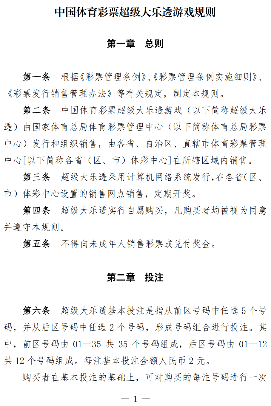 OCR:IMG:中国体育彩票超级大乐透游戏规则 第一章总则 第一条根据《彩票管理条例》、《彩票管理条例实施细则》、 《彩票发行销售管理办法》等有关规定,制定本规则。 第二条中国体育彩票超级大乐透游戏(以下简称超级大乐 透)由国家体育总局体育彩票管理中心(以下简称体育总局彩票 中心)发行和组织销售,由各省、自治区、直辖市体育彩票管理 中心[以下简称各省(区、市)体彩中心]在所辖区域内销售。 第三条超级大乐透采用计算机网络系统发行,在各省(区、 市)体彩中心设置的销售网点销售,定期开奖。 第四条超级大乐透实行自愿购买,凡购买者均被视为同意 并遵守本规则。 第五条不得向未成年人销售彩票或兑付奖金。 第二章投注 第六条超级大乐透基本投注是指从前区号码中任选5个号 码,并从后区号码中任选2个号码,形成号码组合进行投注。其 中,前区号码由01一35共35个号码组成,后区号码由01一12 共12个号码组成。每注基本投注金额人民币2元。 购买者在基本投注的基础上,可对购买的每注号码进行一次