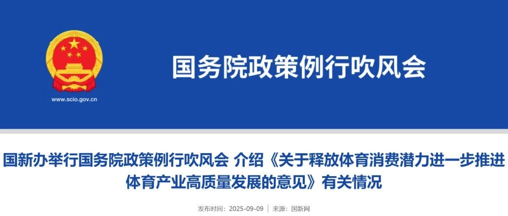 国务院政策例行吹风会于2025年9月9日举行,介绍国务院办公厅印发的关于释放体育消费潜力进一步推进体育产业高质量发展的意见|到2030年,总规模超过7万亿元。主持人:国务院新闻办新闻局副局长、新闻发言人周建设先生。体育总局副局长李静先生、国家发展改革委社会发展司负责人陈俊女士、工业和信息化部装备工业一司司长王卫明先生、商务部服务贸易和商贸服务业司司长孔德军先生、体育总局体育经济司司长杨雪鸫女士出席了会议。