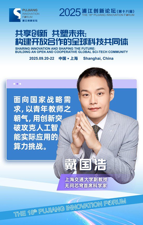 戴国浩在2025浦江创新论坛主论坛上演讲。如今,人类正在经历以人工智能为代表的智能革命,很多中国年轻人已崭露头角。戴国浩就是其中一位,他长期研究稀疏计算和软硬件协同设计,其价值是通过降低任务量、提升硬件利用率,在芯片工艺和峰值算力较低的硬件上,实现对高端工艺和高算力硬件的超越,显著提升通用人工智能的计算效率和能效。2023年,他与合作者创立了无问芯穹,带领团队将这些技术产业化,以解决大模型开发和应用过程中的算力需求问题。这家上海企业已推出一系列终端与云端智能解决方案,为国内众多人工智能企业提供算力服务。戴国浩指出,与上世纪相比,人工智能时代的创新扩散速度快得多,更适合广大青年人才投身其中。1966年光纤通信技术的奠基论文发表后,等待了43年才迎来诺贝尔物理学奖,而预测蛋白质结构的人工智能系统AlphaFold从问世到获得诺贝尔化学奖,仅用了6年。“就像习近平总书记在调研模速空间时所说的,人工智能是年轻的事业,也是年轻人的事业。”在他看来,我国“人工智能+”行动目前面临三大算力挑战:一是在高性能芯片受限的情况下,自主可控的等效应用算力亟待提升;二是多元异构芯片缺乏协同,算力资源碎片化;三是智能终端存在1—2个数量级能效差距,难以满足多模态、高推理、强能效需求。